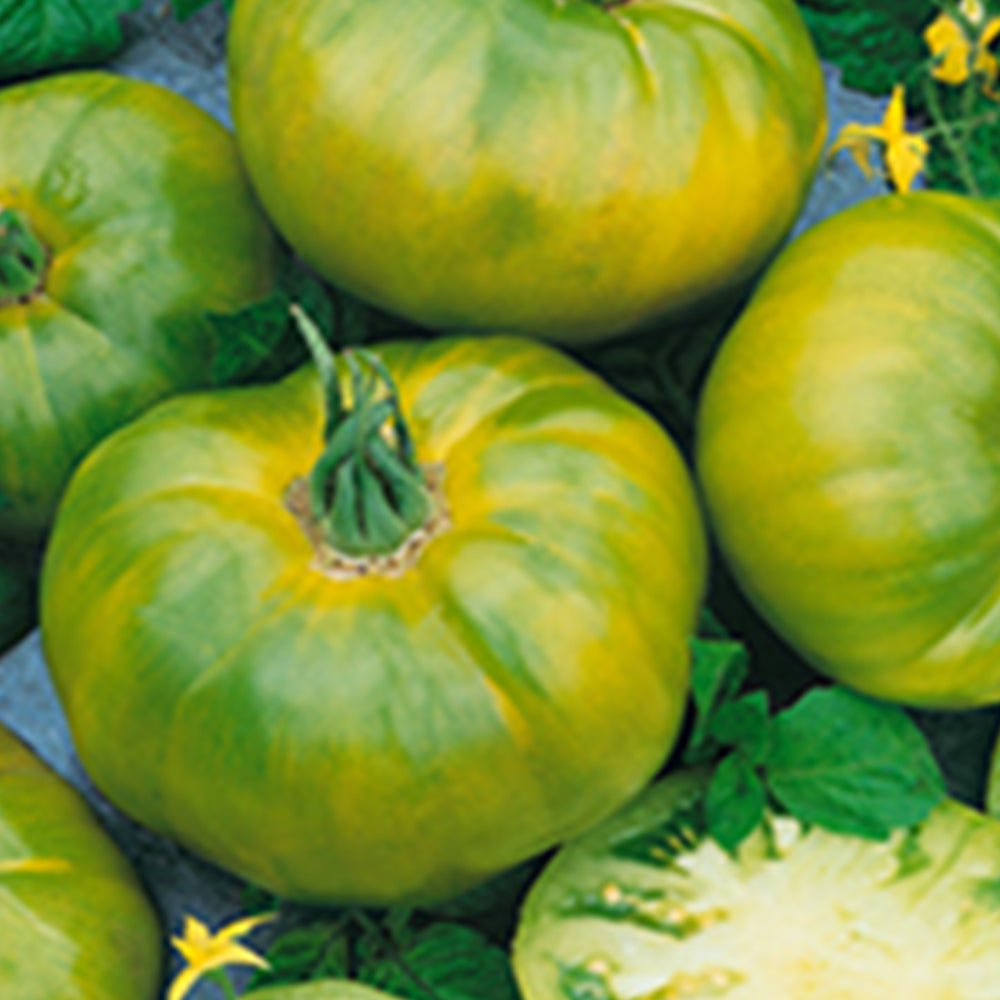 ALL AMERICA SELECTIONS WINNER. This is one of the first green colored varieties with disease resistance, and it impressed judges in the All America Selections program. Green when ripe, tomatoes have yellow streaks and are 9 to 10 ounces with a wide, flat shape and a wonderful, sweet, citrus-like flavor. Crack resistant, but should be picked when they are still slightly firm. Indeterminate. 90 days.