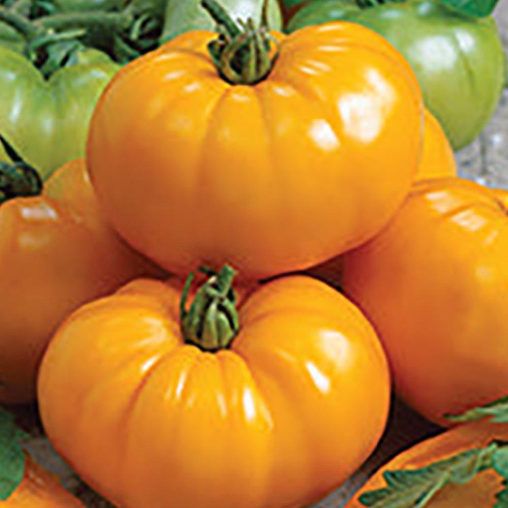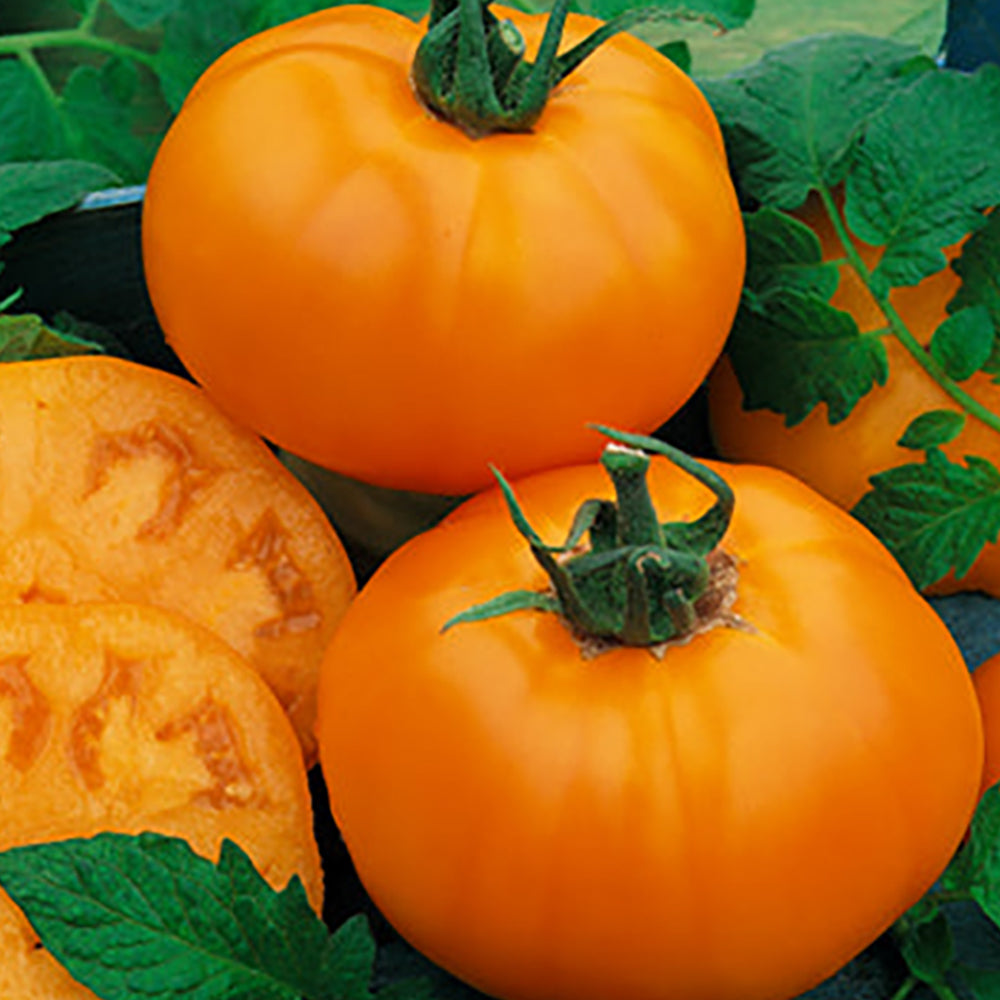 ALL AMERICA SELECTIONS AWARD WINNER. This crack-resistant hybrid originated with the heirloom Amana Orange and retains that wonderful old-fashioned flavor while adding some improvements. The hybrid has 9 to 12 oz. tomatoes that mature much earlier than Amana Orange and do not crack. The color both inside and out is a beautiful glowing orange that holds its intensity even when tomatoes are cooked, lending itself to creative uses by chefs. Vigorous plants are quite productive and are resistant to Tobacco Mosaic Virus and anthracnose. Indeterminate. 75 days.