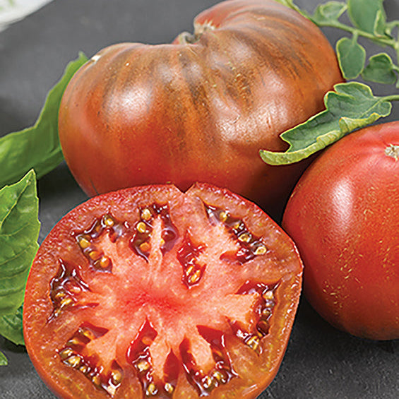 Delicious 9 to 10 ounce fruit are firm and smooth, having excellent flavor and purple color all the way through. If you love Cherokee Purple you will also like this tomato. Vigorous indeterminate plants mature in 80 days.