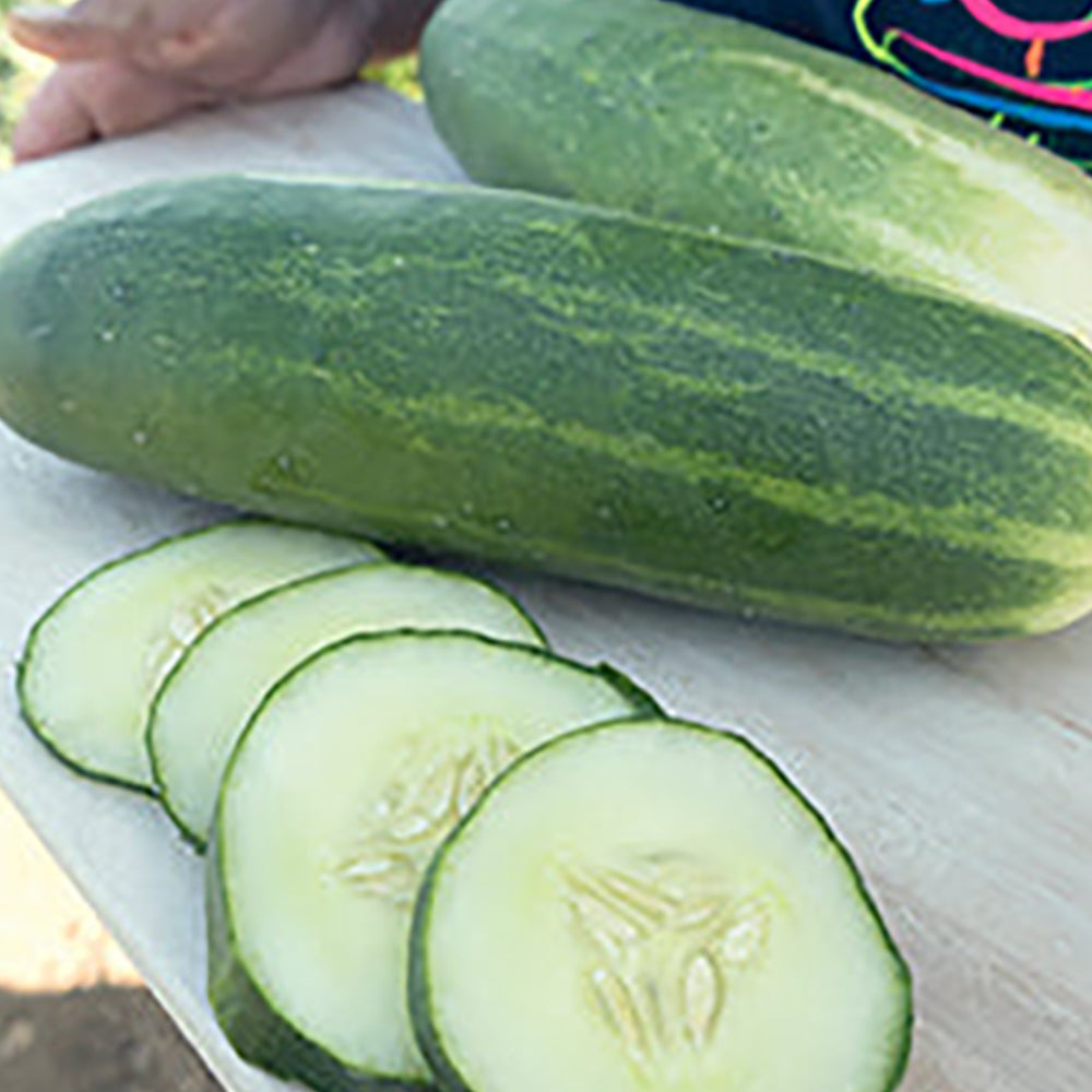 Produces dark-green fruit up to 9 inches in length, with a crisp and sweet flavor that persists even under stress. Multiple disease resistances keep plants vigorous and productive over a long picking season. Developed at Cornell University. 65 days.