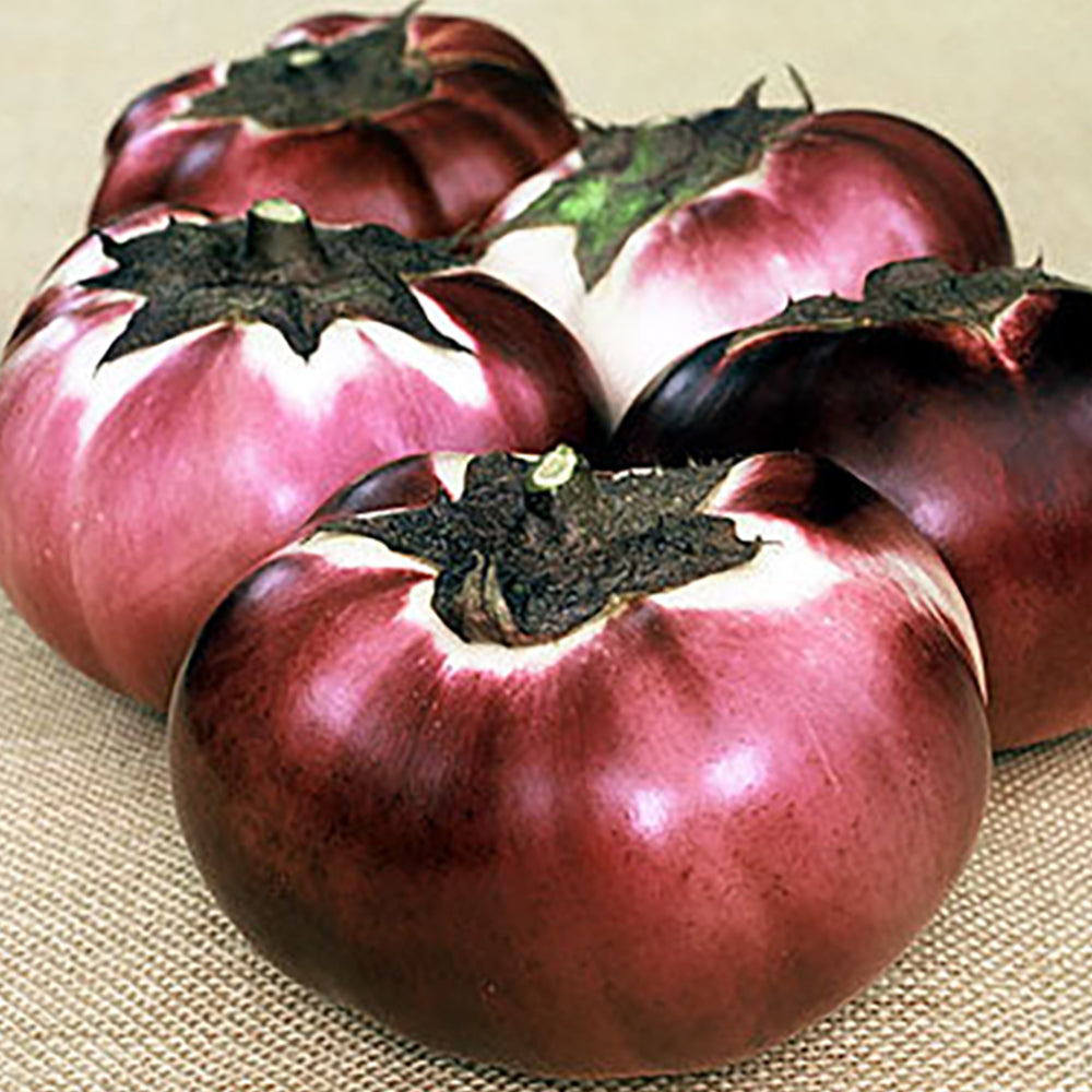 This beautiful eggplant is spherical, about 4 inches across, with rosy-lavender thin skin and a pure white interior. We love to cook with this variety as its size is ample without being overwhelming, and the flesh is mild and meaty with absolutely no trace of bitterness. Earliness and great productivity add to the attributes of this terrific eggplant. 65 days.