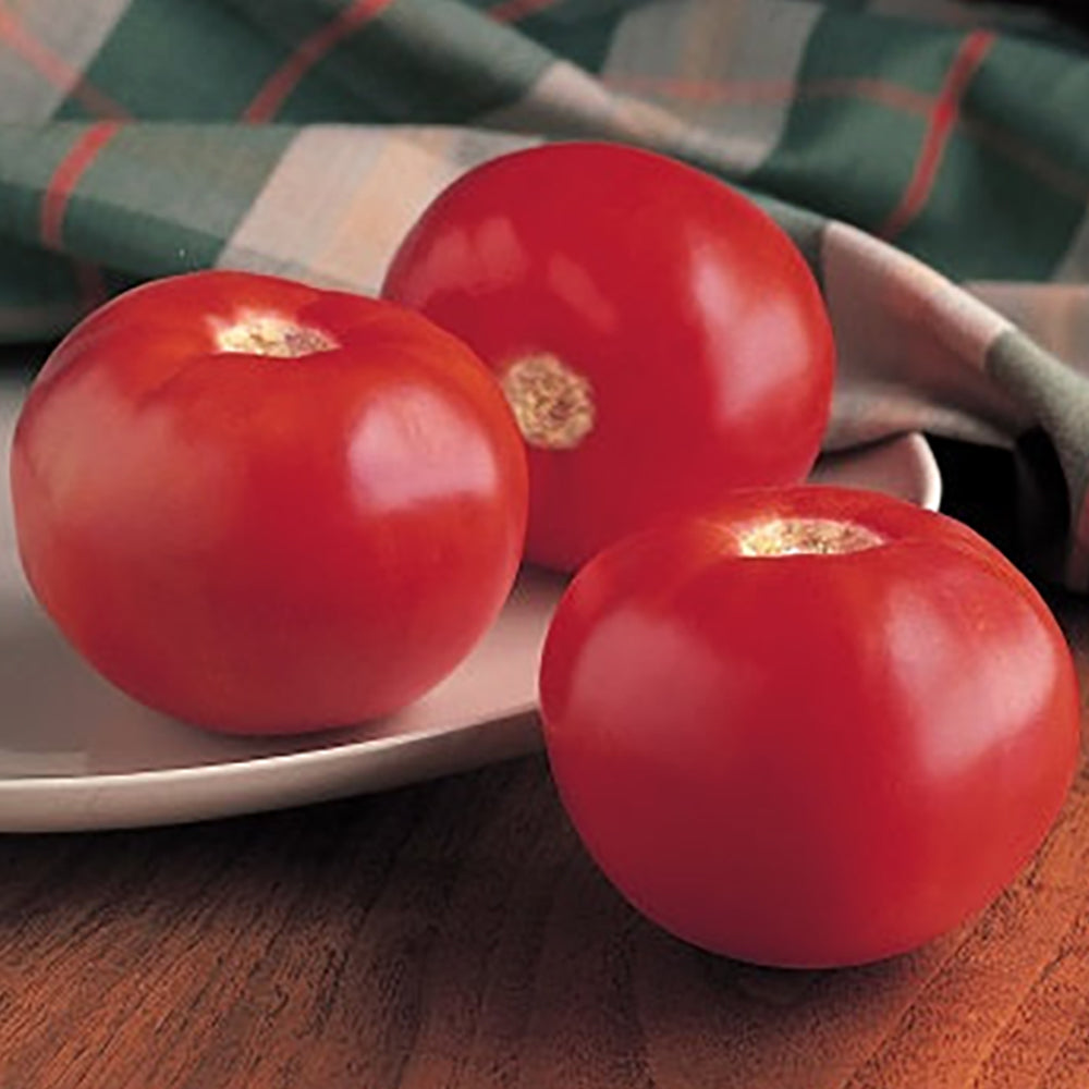 This high-yielding beefsteak has a bush growth habit and can be grown in a container. A sister of Better Bush, the dense foliage helps protect fruit from sunburn. Flavor is excellent with the right balance of sugars and acids. Fruit set is somewhat concentrated, weighing 10 ounces on average. Plants benefit from support. Disease package F1,F2,Ss,TMV, V, S. Determinate. 68 days.