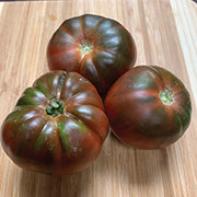 The origin of this tomato is believed to be from Dr. Harold Martin, who was a hobby gardener and a dentist. He did not release the tomato in the 1920s when it was first selected, but it was released later by a person who inherited Dr. Martin’s collection. Initially there were some concerns about the variability of the variety, and it has taken time for people to judge the plant. It is indeterminate and purple-maroon in color, weighing 5 to 8 ounces. It has a sweet fruity flavor. The current selection from the collection is a regular leaf type. 85 days.