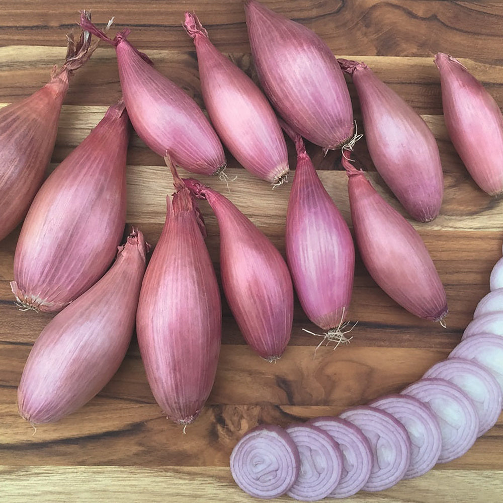 This is the first-ever All America winning echalion shallot. It has a beautiful copper-pink outer skin, and an even more attractive rosy-purple inner skin. French chefs love this type of shallot because they are easy to peel, have more interesting flavors, and caramelize easily when heated. Perfect to plant in the garden, or sell at a farmers market. Plants reach 24 to 30 inches, and the bulb is 4-5 inches in length. Can be grown in a container as well. Space 3 to 4 inches apart. Transplant in March, or direct seed in April or May. 90 to 100 days.