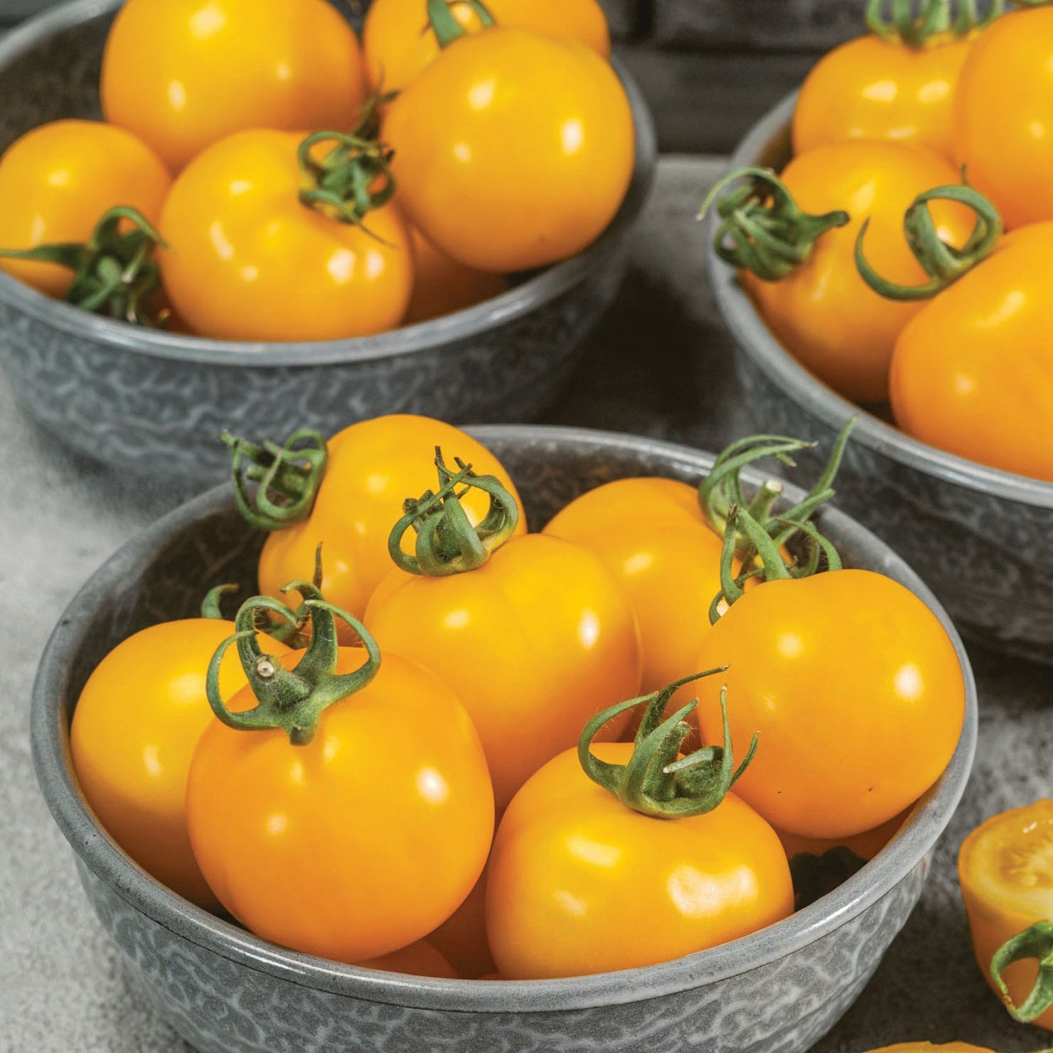 These beautiful yellow cherry tomatoes taste sweet and citrusy, but not acidic. Great for fresh eating or for salads. The 1 inch fruit weight about an ounce with some cracking tolerance. This variety tends to keep producing even in the heat. The 4 to 5 foot plants are indeterminate. 70 days.