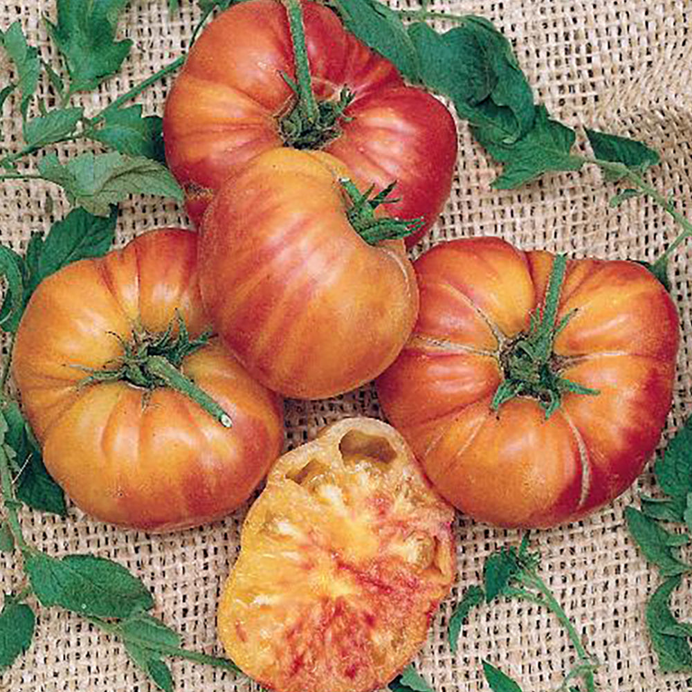 Flame-Beefsteak is a large yellow tomato with red streaking that is mild, sweet, and can reach a pound or more. Fruit have variable amounts of red streaking. Indeterminate. 75-80 days.