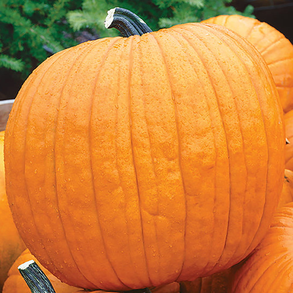 Developed by John Howden in the 1970s, this pumpkin is one of the most popular varieties for gardeners. Weighing 20 to 25 lbs, and having a deep orange color, with uniform sizes, it is a classic size and perfect shape for carving. Strong handles. 110 days.