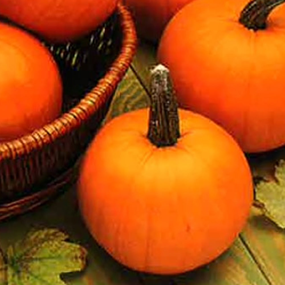 Fruit are bright orange, measuring 5 by 6 inches, and weighing 3 to 4 pounds. The fine grained flesh makes delicious pies, and the fruit keep for a long time after harvest. A strong stem attachment and small size, provides the perfect pumpkin for younger kids in the pumpkin patch. Early maturity allows you to plant later than other pumpkins. 85 days.