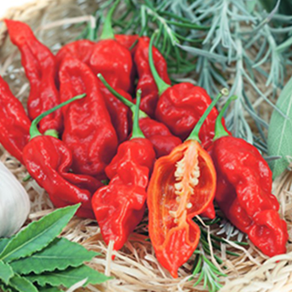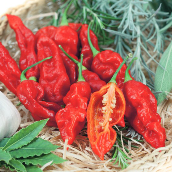 Blistering heat is the hallmark of this hybrid Ghost pepper. armed with more than 800,000 scoville units of heat. Be careful handling, consuming,and preparing. This bright red and pointed fruit is 2 ½ inches in length and has higher yield potential than other open pollinated Ghost peppers. 90 days.