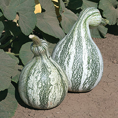 These attractive fruit sport green stripes over a creamy white background, and weigh between 12 to 20 pounds, and measure 18 to 20 inches in length. The hard rinds and firm sweet flesh, and are good for baking, canning or boiling. 110 days.