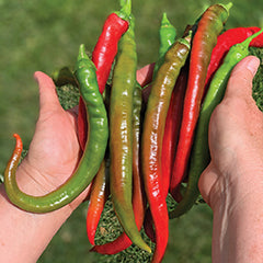This chili pepper is different from others in its class, sporting 6 to 9 inch fruit that mature green to red and taper to a point, reminding us of its namesake – Texas Longhorn cattle. Pungency reaches 10,000 to 20,000 Scoville units, offering a punch for those who like it hot, and flavor just right for salsa. Plants grow to 40 inches and will require staking due to heavy yield potential. Does well in hot climates. 85 days.