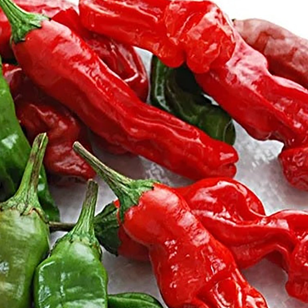 This rare pepper is was discovered by journalist Frank Tolbert while he was working for the Dallas Morning News. He had an interest in chili peppers of all kinds. One of his favorites had an unusual shape. Some believe the fruit look anatomical. Frank made what he called some of the best chili in Texas using Red Peter peppers. Flavorful and fruity, Red Peters are good roasting peppers. They are also hot - 10,000 to 25,000 scoville units. The fruit are 4 to 6 inches in length and mature from green to red. Plants grow 20 to 30 inches in height. 80 to 85 days.