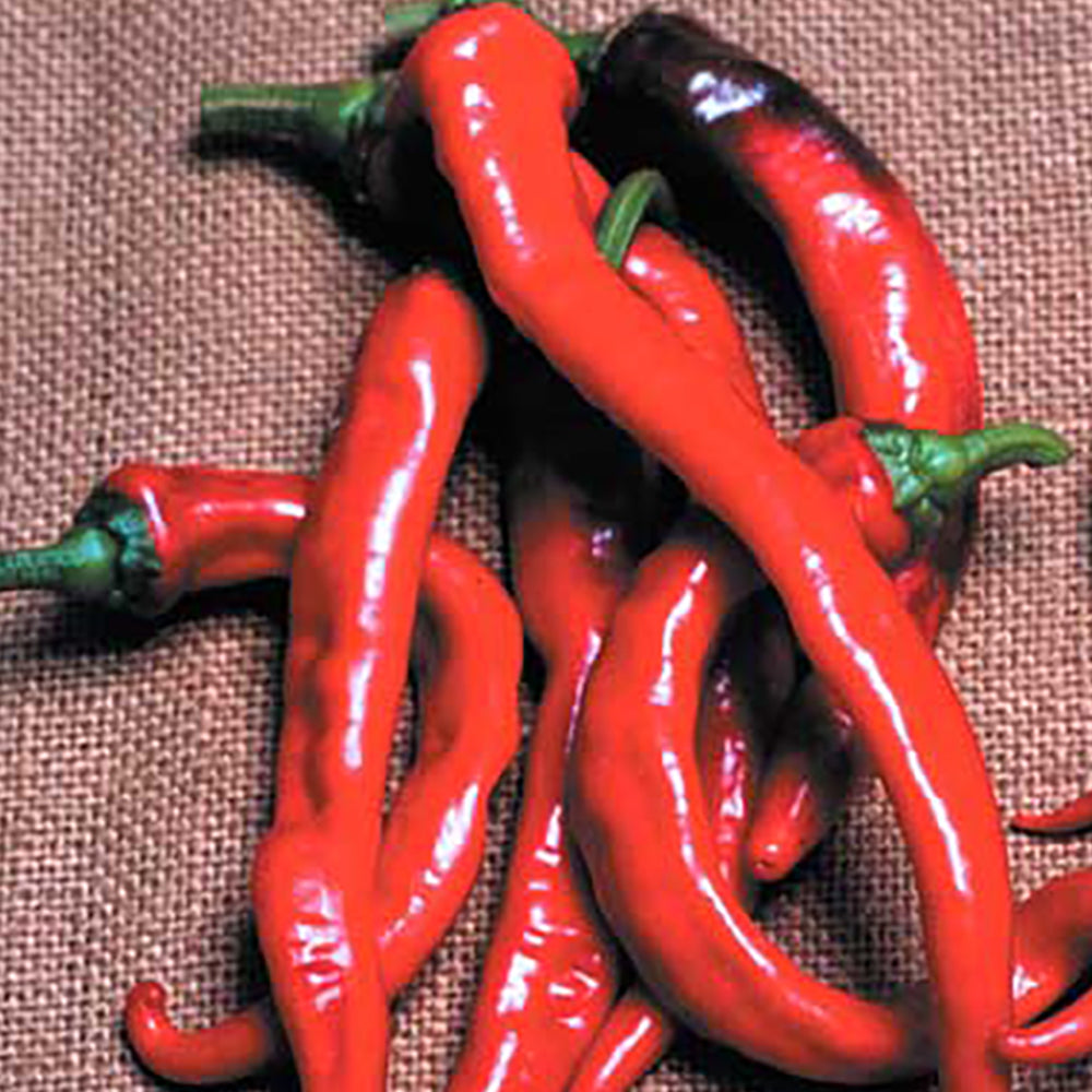 Bountiful harvest of pencil-shaped fruits that are 5 inches long and ½ inch thick, but often curled and twisted. Flavor is red hot and best used in very hot dishes. Easily dried. 75 days.
