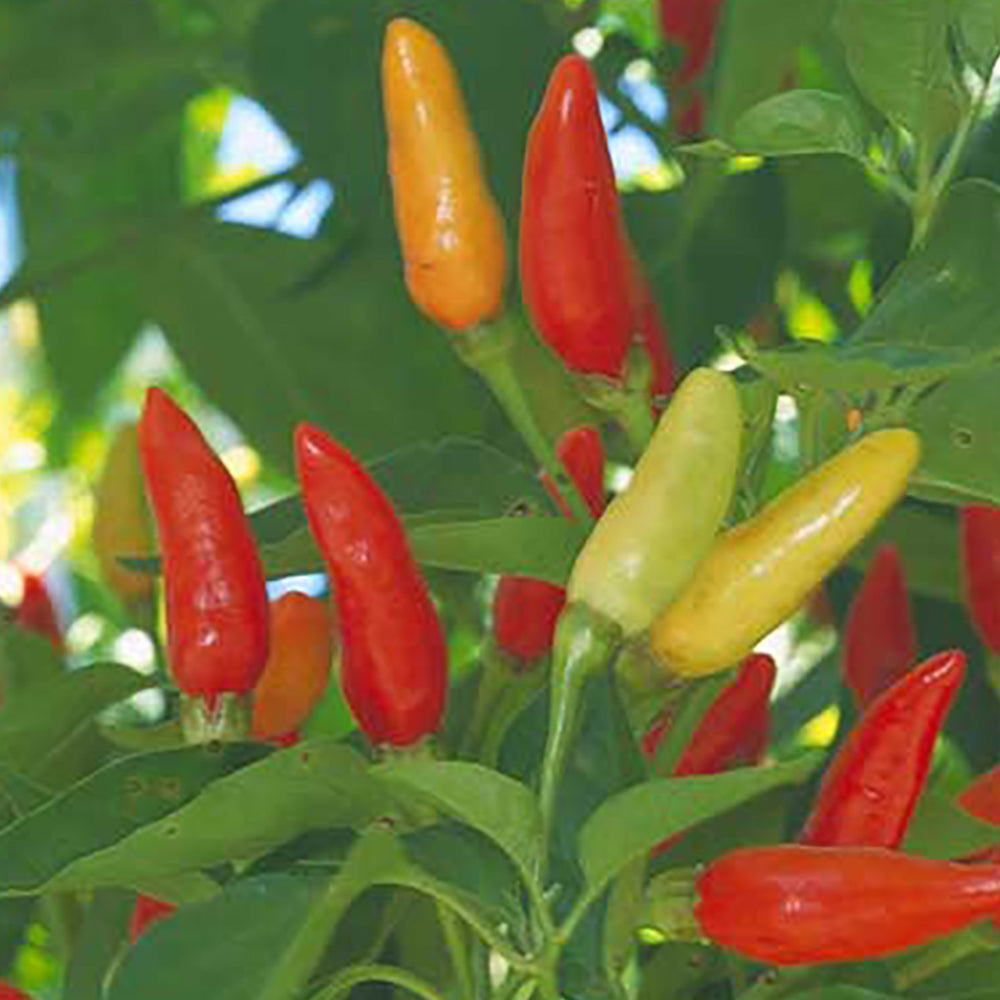 Very hot chile called for in many recipes. Candle-flame shaped fruit are 2¼ inches long, green, then red at full maturity. Borne on attractive 30 to 36 inch branching plants. Suitable for salsas and sauce recipes as well as eating fresh. 75 to 80 days.