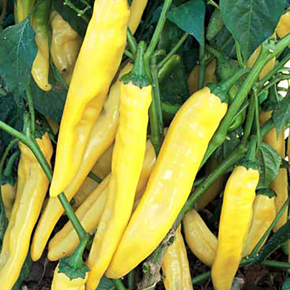Released by the New Mexico Agricultural Experiment Station. The first chile pepper that turns bright yellow at maturity. Beautiful smooth fruits are 4 to 6 inches long and excellent for drying and making into wreaths or ristras. Also good to eat, with a typical chile pepper flavor. 75-80 days.