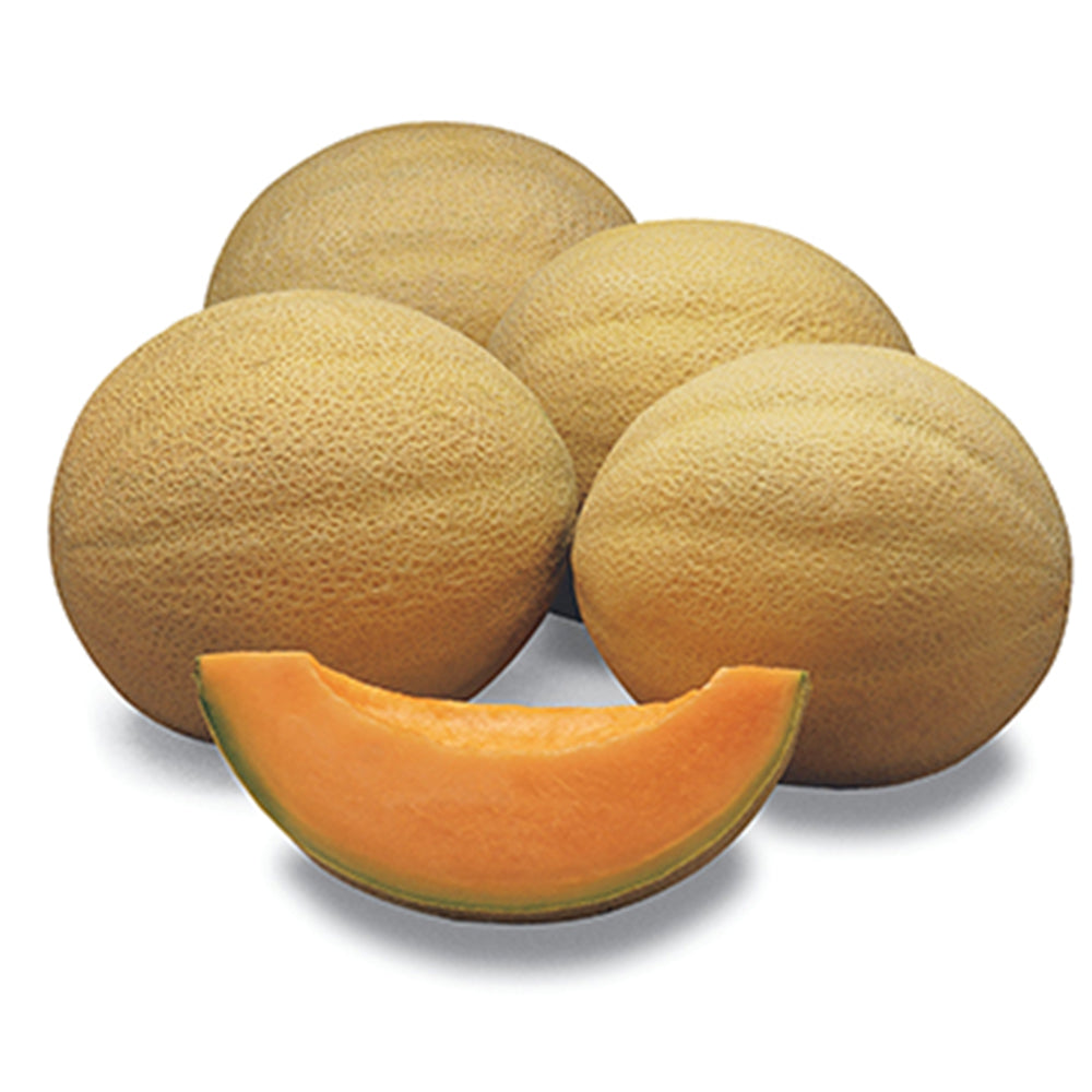 Both a home garden favorite and a commercially preferred cantaloupe for those who pick and ship fruit. The thick netting, and a strong rind provides good shelf life. The 5 to 6 pound fruit are delicious and aromatic with beautiful bright orange flesh. Disease resistance to fusarium (0-2) and powdery mildew, gives Athena an ability to perform well in many environments. Harvest when the melon easily slips from the vine with a light pull. 75 days.