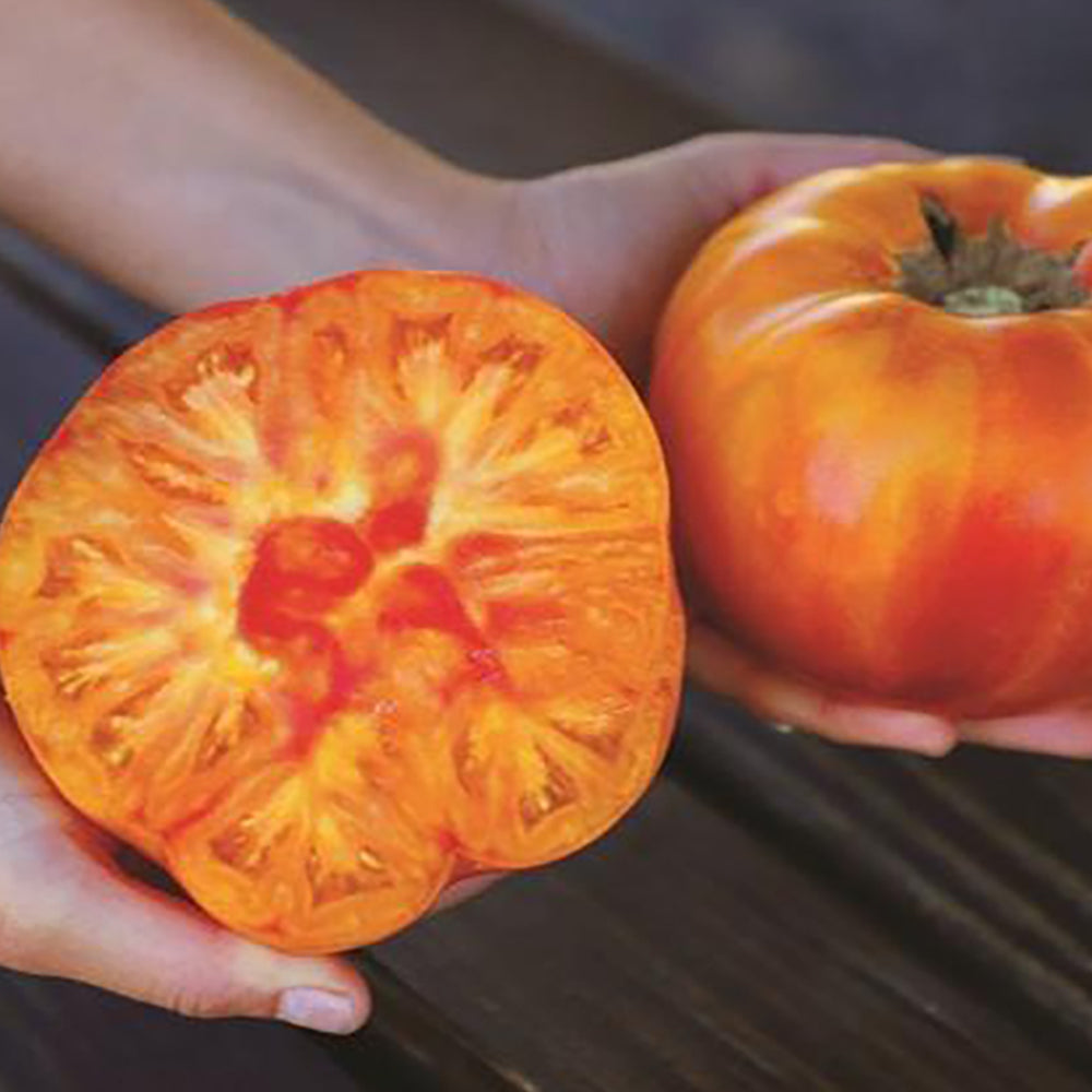 This beautiful tomato is a ribbed beefsteak type with sweet and meaty flesh. It resembles an heirloom tomato but is more firm. The interior is yellow with red streaks, while the outside is mostly yellow, occasionally turning orange and yellow. Fruit weighs 18 to 24 ounces. The strong indeterminate vines produce fruit over a long period due to excellent disease resistances FFFVV and intermediate resistance to Spotted Wilt Virus, and Late Blight. All-America regional winner. Indeterminate. 75-80 days.