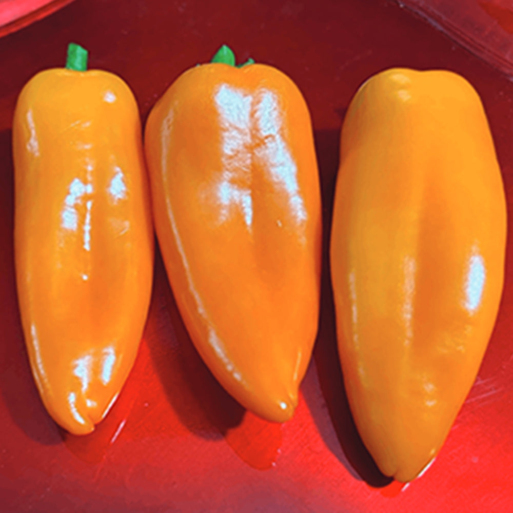 Yummy Snack Orange hybrid pepper produces deliciously sweet, and crunchy fruit that are fun to eat. The fruit mature from emerald green to brilliant orange on a plant that continues to produce over the growing season. Pick the ripe fruit each morning and take them with you to snack on during the day! The fruit are 3 ¼ to 3 ¾ inches long, and 1 ¼ inches in width. There are few seeds and plenty of flavor in each bite. Due to the continued fruiting in most environments, plants benefit from support stakes. Well-suited for growing in containers of at least 3 ½ gallons. 65-75 days.