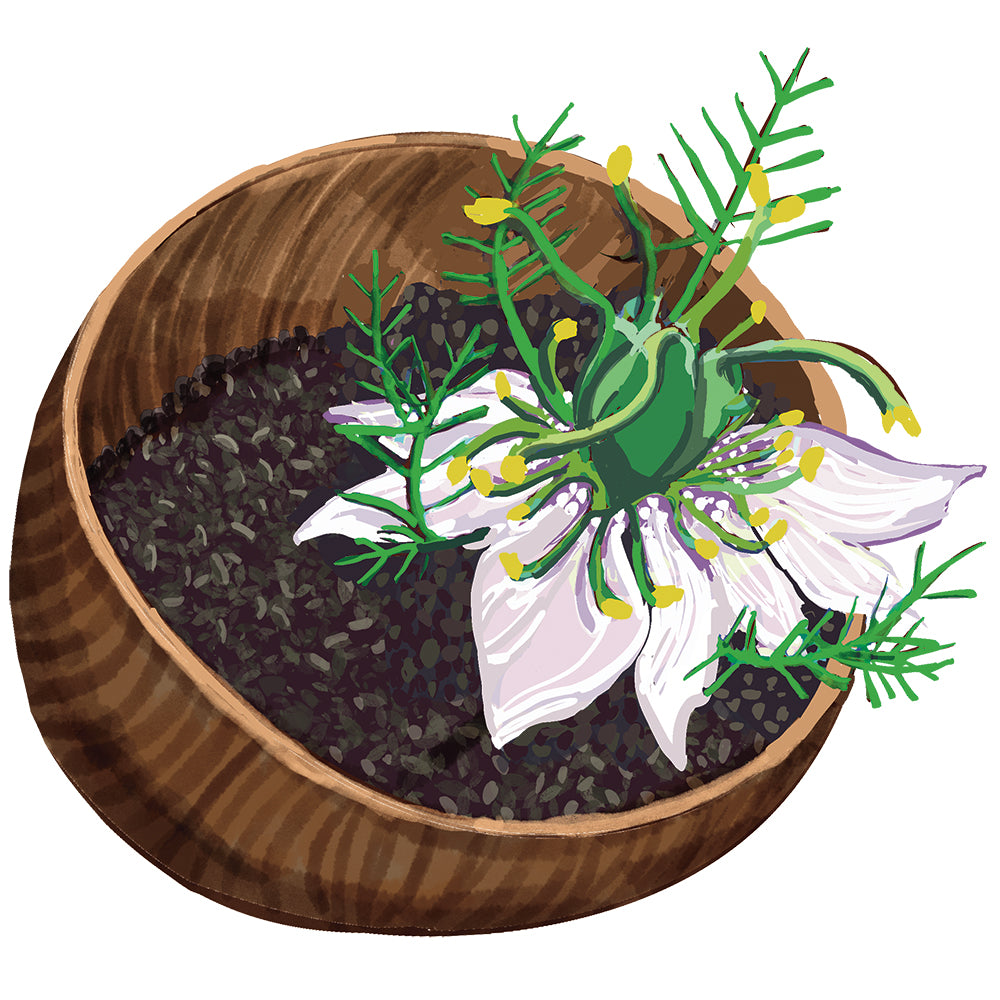 Black cumin is also called black caraway, fennel flower, or nigella. The fruit produce large capsules that have numerous seeds. Those seeds are used as a spice in curries, meat dishes, rice dishes, or even in homemade pickles. The flavor is slightly peppery, with hints of onion and oregano. Plants reach 8-12 inches. Seed pods can be harvested at 90 days once the pods start to turn brown and rattle when shaken. (Nigella sativa)