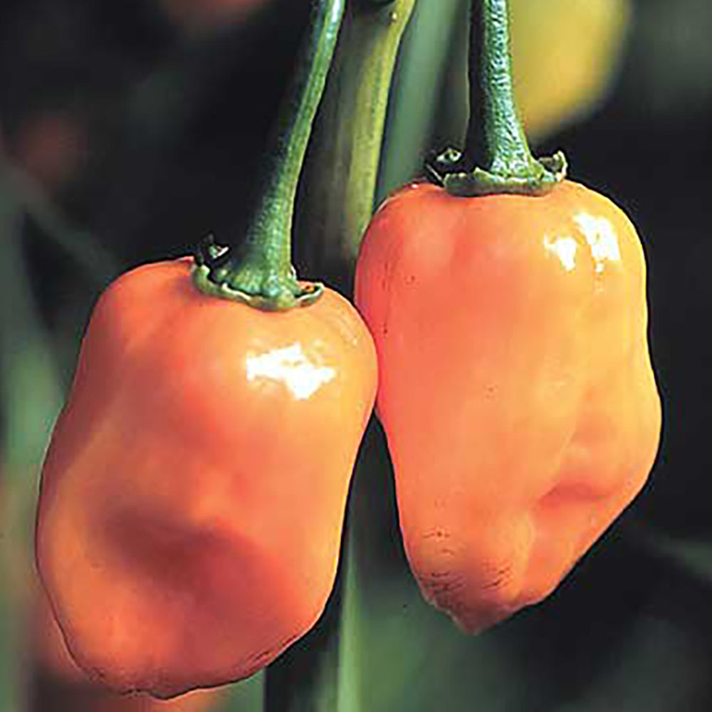 A blistering-hot pepper 40 times hotter than Jalapeno! Among the most potent ones we sell. Wrinkled fruit is 1 inch long and 1½ inches wide, with a tapered end. Peppers begin as light green then turn to golden-orange and are loaded onto 36 inch tall plants. 90 to 100 days.