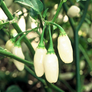 These creamy white peppers are smaller than the typical habanero, only about 1½ inches long and ½ inch across, but with the same habanero heat and distinctive fruity flavor. Expect abundant harvests of these very hot peppers. 90 days.