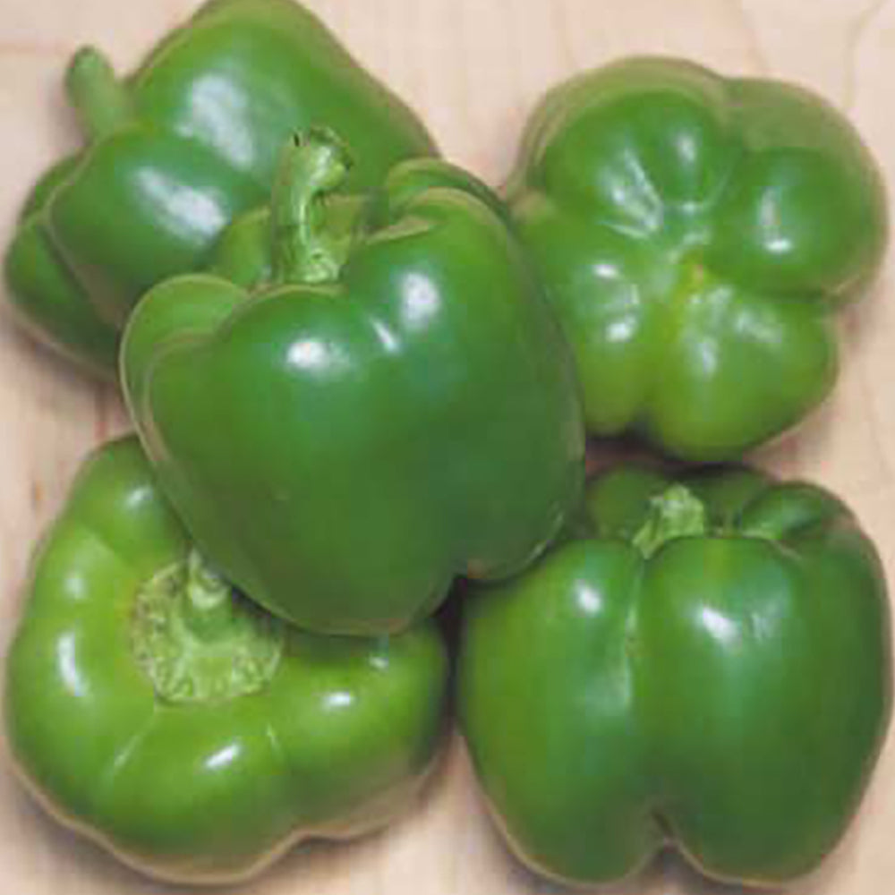 High yields and extra-large fruit have made this the most popular open-pollinated bell pepper. Dark-green peppers are mostly 4-lobed and blocky, about 4½ inches long and 4 inches wide, with crisp, thick walls and sweet taste. Tall plants are Tobacco Mosaic Virus resistant and produce an abundance of peppers. 75 days.