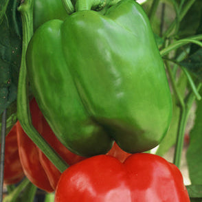 Very large, 4-lobed blocky bell pepper is hard to beat for its earliness and large size. Fruit becomes 4½ inches long and wide, and seems to set well even in heat. Plants provide good foliage cover and are resistant to two types of bacterial spot and three pepper viruses. 60 days green; 75 days red.