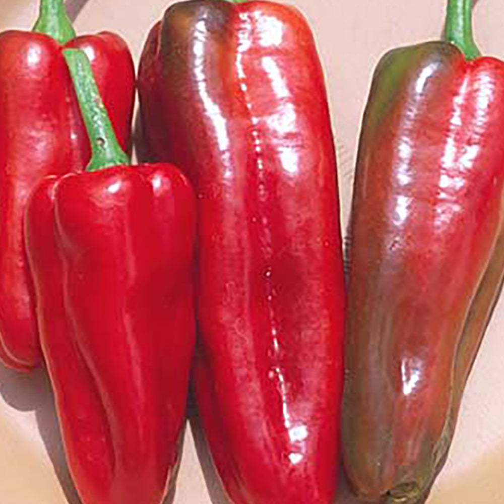 Deep-red, extremely sweet, 7 inch long Italian peppers are tapered with a blunt end. Often used for frying, but are also delicious when eaten fresh. Later to mature than a bell pepper, but also sweeter. Vigorous plants bear loads of high quality fruit. 90 days.