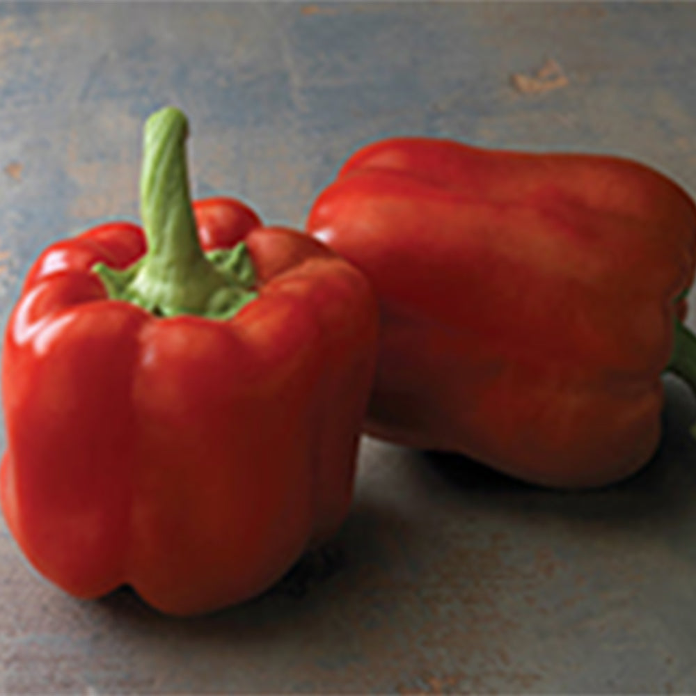 This extra-large, blocky bell pepper is very thick-walled and capable of becoming just huge. Peppers begin as dark green and ripen to a candy apple red, the stage when the fruit is sweetest. Strong plants are resistant to 3 races of bacterial spot, and continue to produce throughout a long season. Mature green in 70 to 75 days.