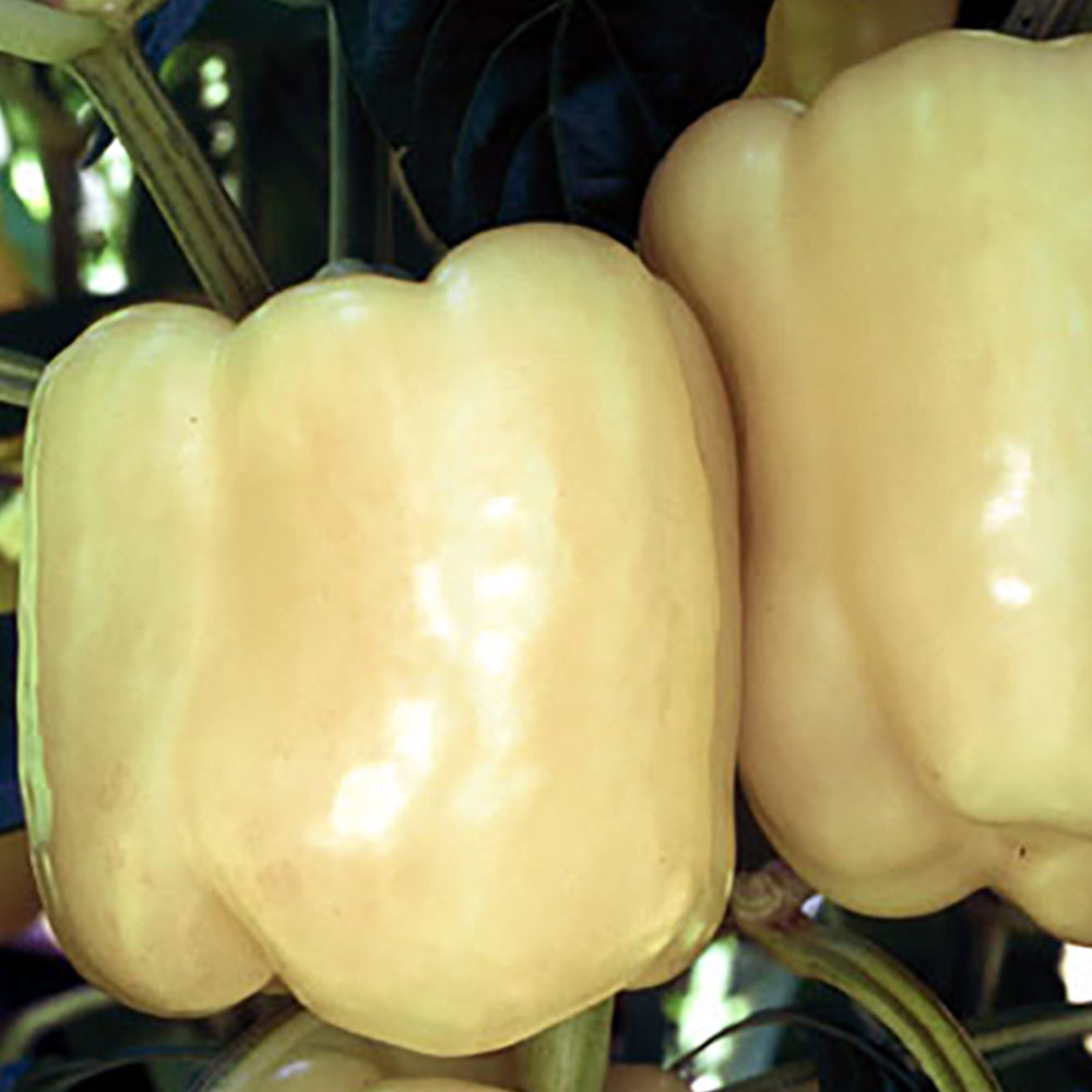 This is a premium ivory bell pepper with 3 to 4 lobes and blocky shape. It retains its creamy white color for an extended period before turning orange, and finally light red. Plants are vigorous, resistant to Tobacco Mosaic Virus and provide excellent cover for these very attractive fruit. 70 days.