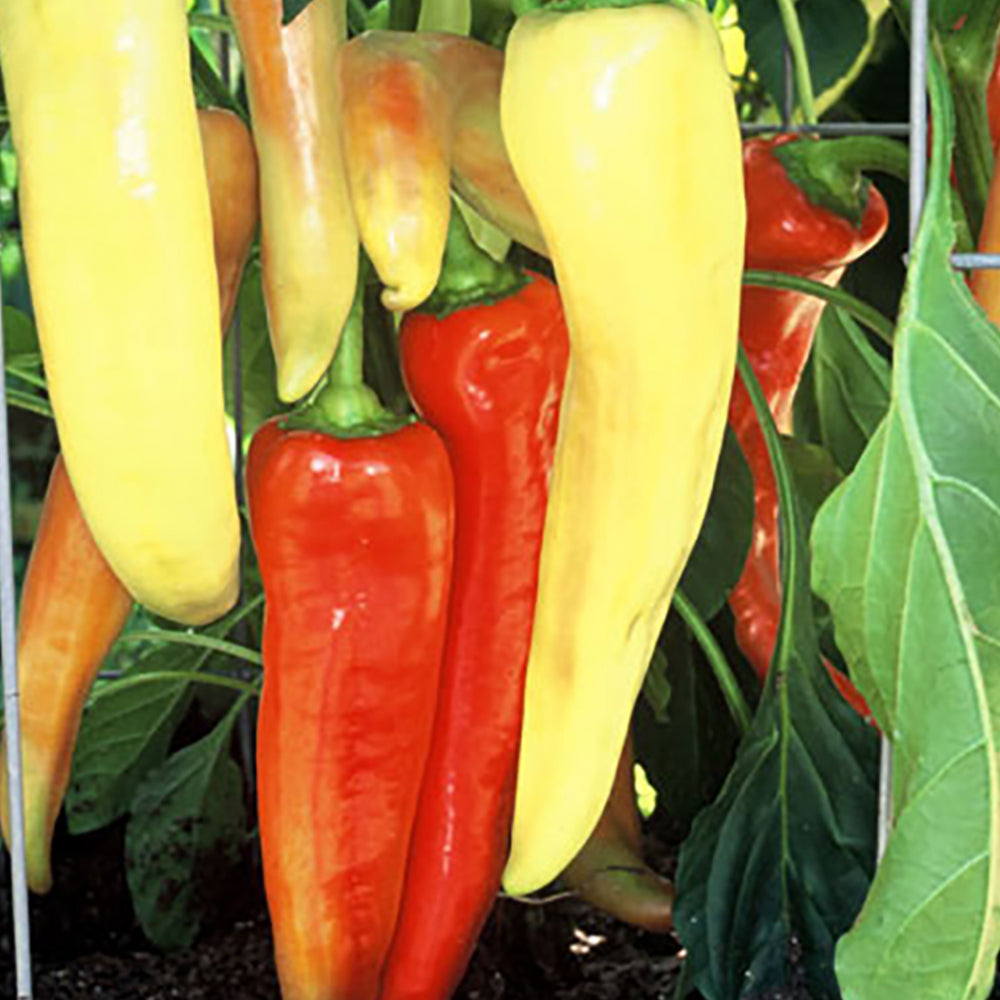 This hybrid Sweet Banana type lives up to its name in that it puts out an incredible harvest of huge peppers that measure nearly a foot long. Peppers are typically 9 to 10 inches long and 2 inches across, and turn from light yellow to orange and finally red. Sweet flavor for eating fresh or cooked. 65 days.