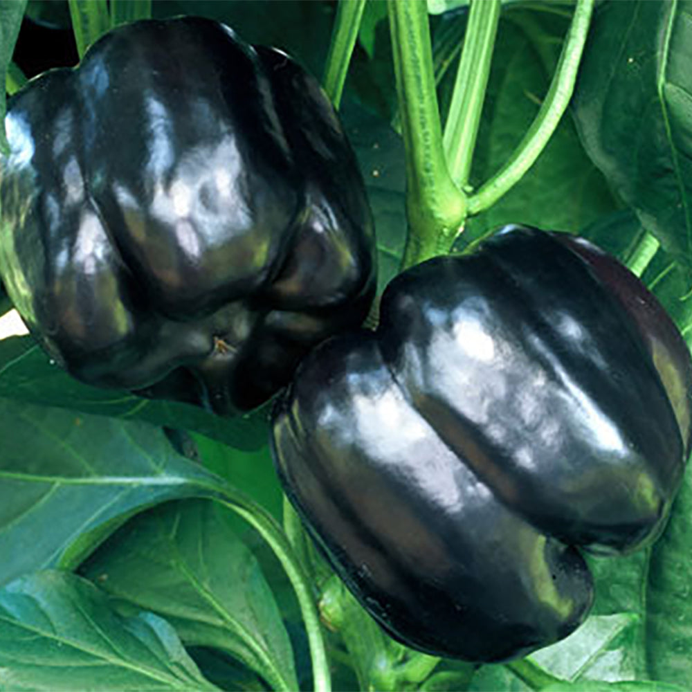 Blocky, thick-walled, dark purple bells set well not only in the crown, but also as limb set. Compact plants offer good foliage cover for the fruit. Beautiful in salads as well as stuffed. 70 days.