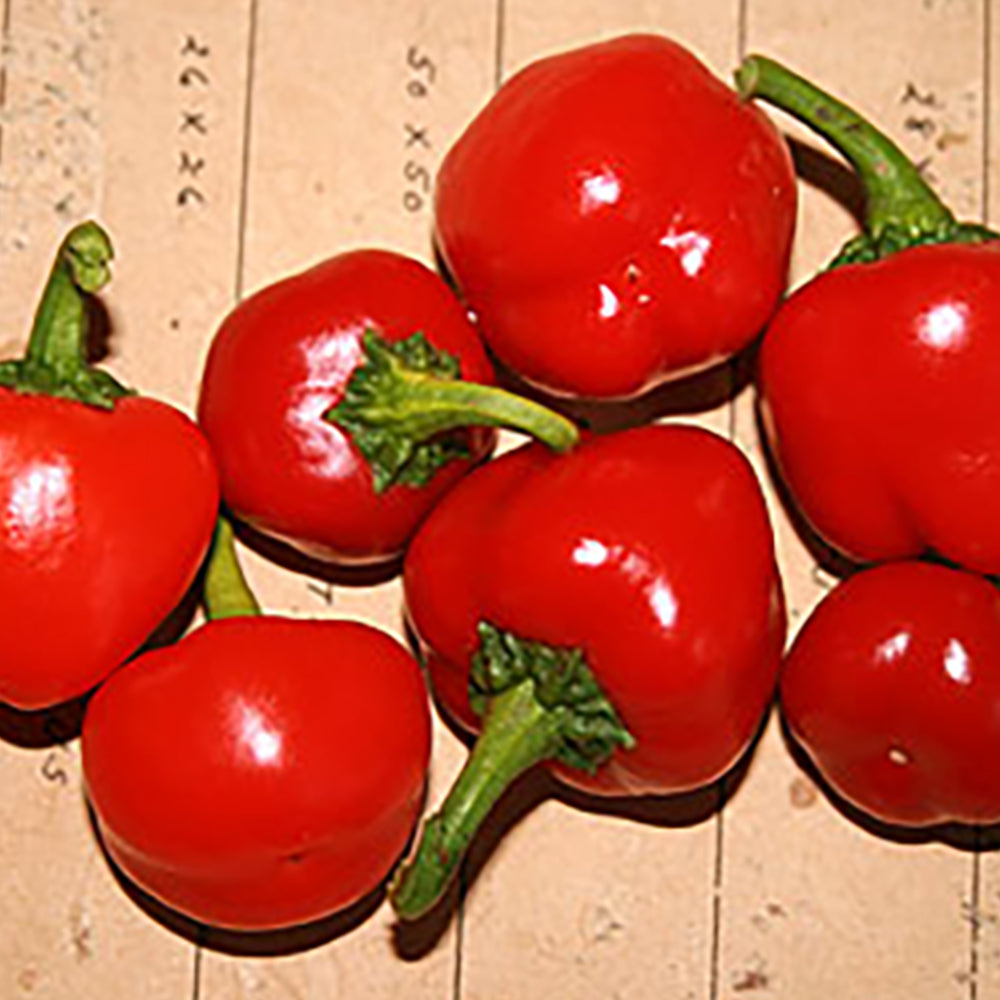 Before bell peppers began to dominate sweet pepper offerings, people grew more pimento peppers for their meaty, sweet flesh and thick walls. This Ohio family heirloom could convince you to try them again. The fruit has a rich, aromatic flavor that is great for eating fresh, roasted, cooked, or canned. They are sturdy, 2½ inches long and wide, rounded and ribbed with few seeds. Easy to grow with big yield potential. 70 days.