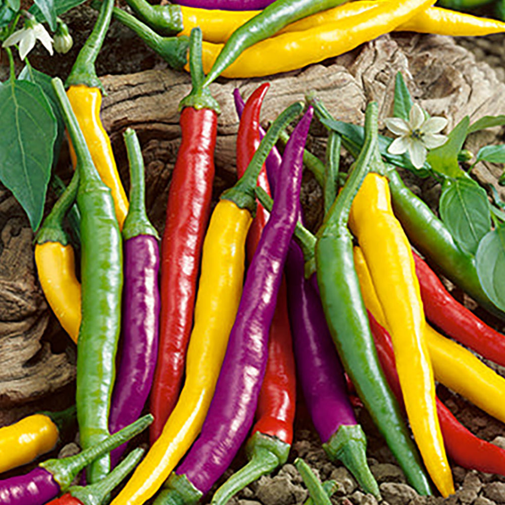 This mix contains red, yellow, purple, green, and orange colored cayenne varieties. The small tapered three inch fruit are pungent. They are edible and make an excellent display for ornamental gardens. When dried, they keep their attractive colors. Plants grow up to 20 inches in height. Average maturity 57 days.