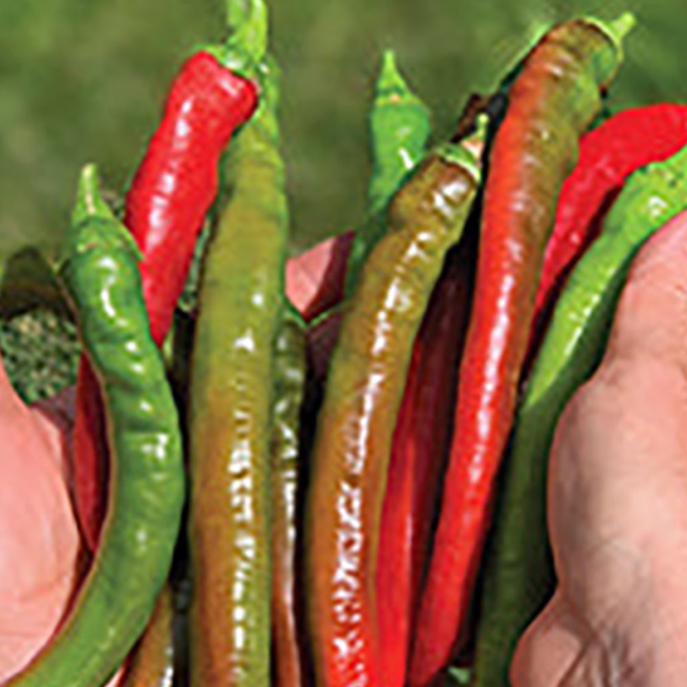 This widely adapted pepper produces an abundant set of fruit that mature from green to red on plants reaching up to 30 inches in height. There are so many fruit, you will be challenged to keep up with the green roasters while many turn to red for a sweeter and more complex flavor. Fruit are normally harvested between 6 and 7 inches in length, and 1 ½ inches in width. 75 days.