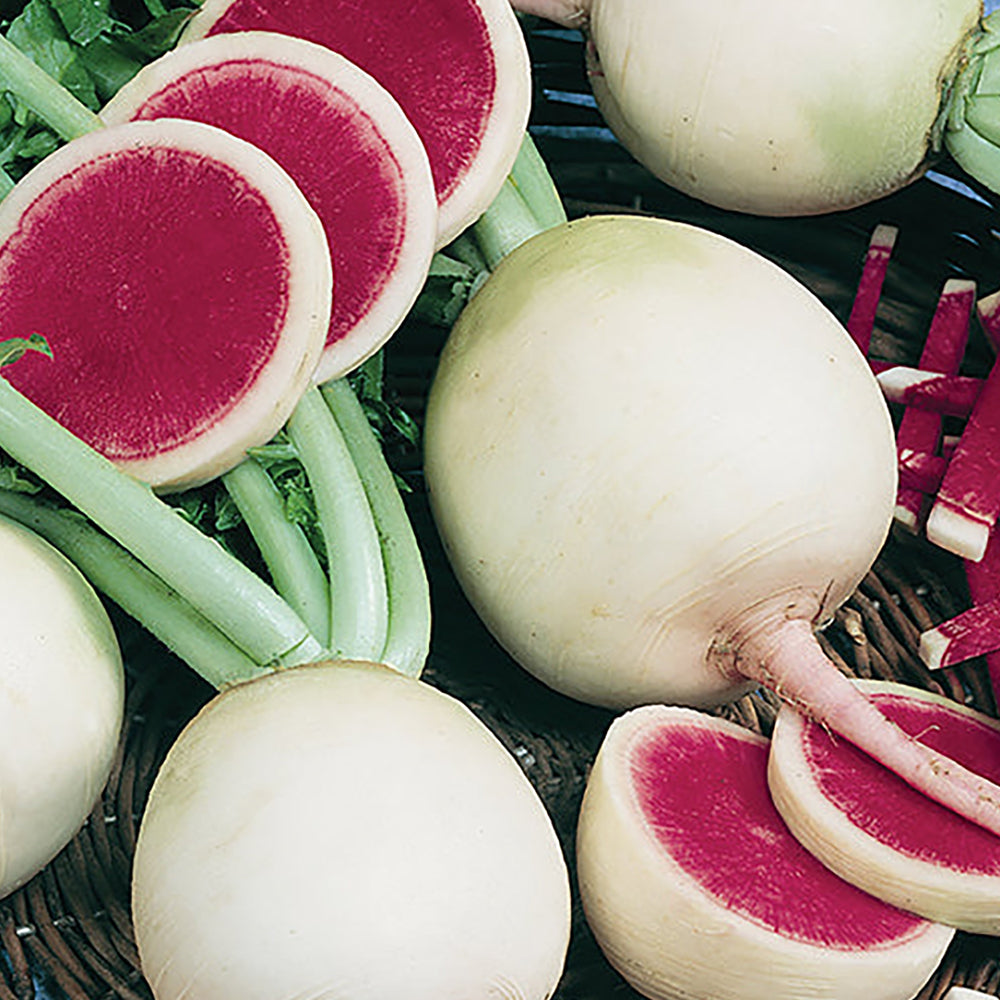 Asian heirloom with a white exterior and pink to red interior. It is sweet and crisp, in contrast to most radish varieties. Great for garnish, salads, or even pickling. The large tops make picking easy. 59 days.