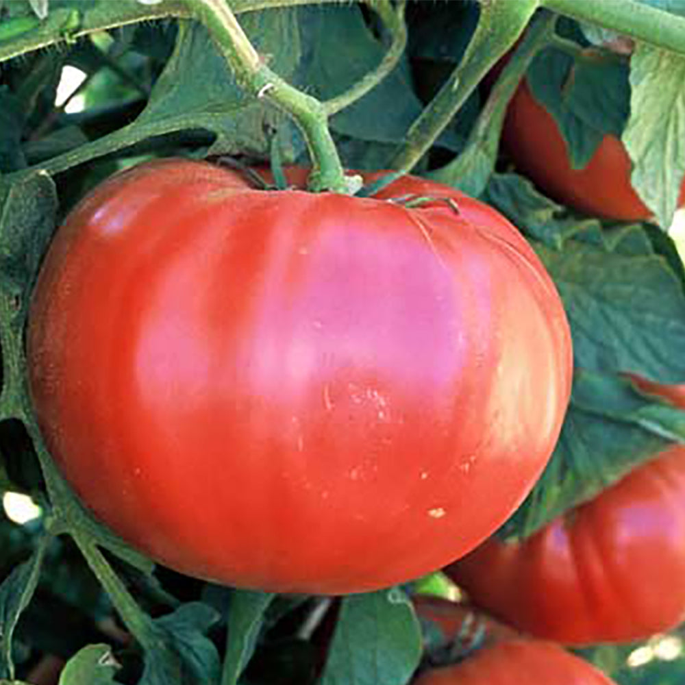 Vine doesn't really climb, but can reach 15 ft. or more by season's end. Each plant yields bushels of dark pink fruit, each weighing about 1 lb. Tomatoes are mildly flavored and meaty with few seeds. Indeterminate. 90 days.