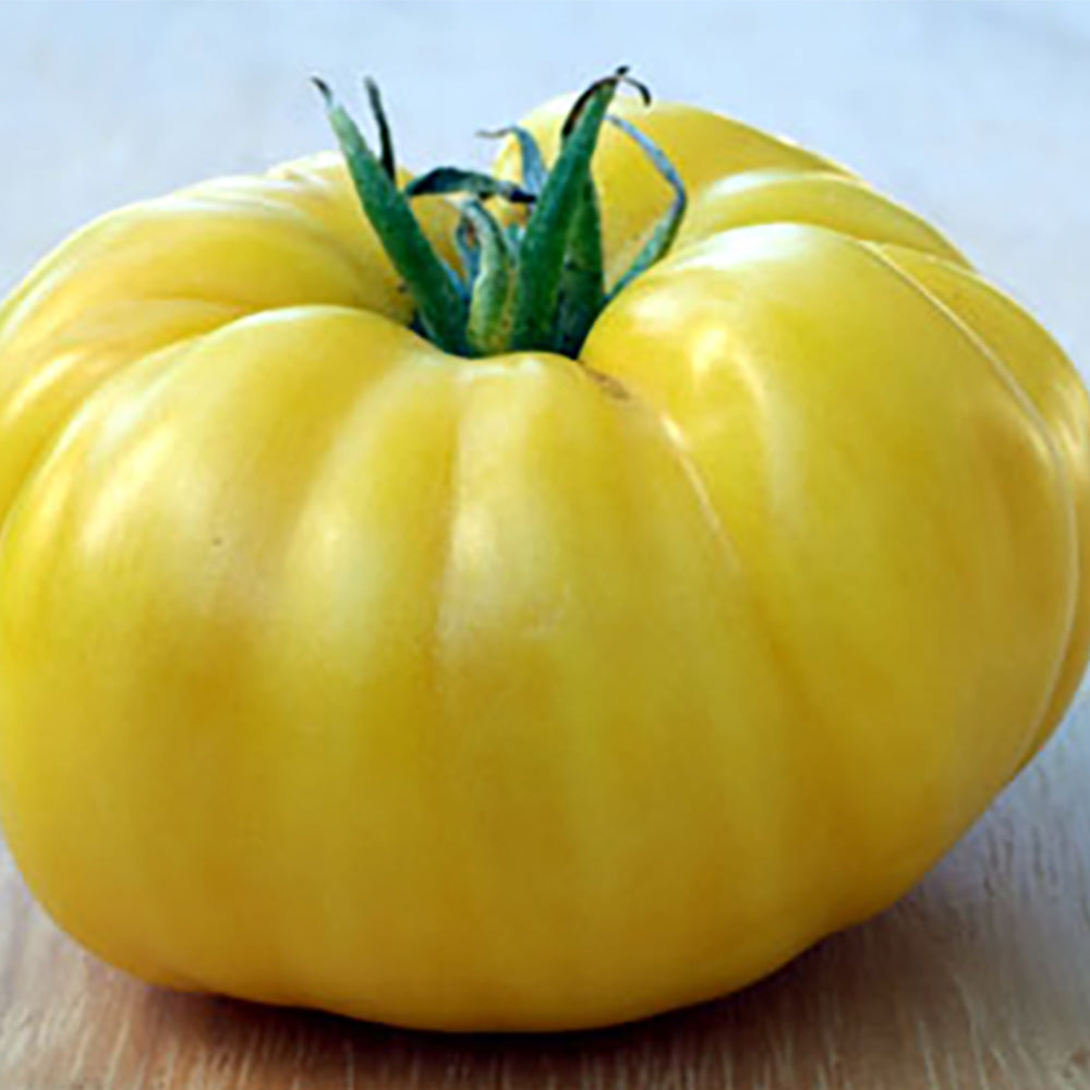 Fabulous, sweet fruity taste in a huge, clear lemon-yellow beefsteak tomato make this variety outstanding. Some of the 1 to 2 lb. fruit have a pink blush on their blossom ends. This is an heirloom variety that grows on large plants and yields a good harvest. Excellent flavor and not so late as some others of its type. Indeterminate. 85 days.