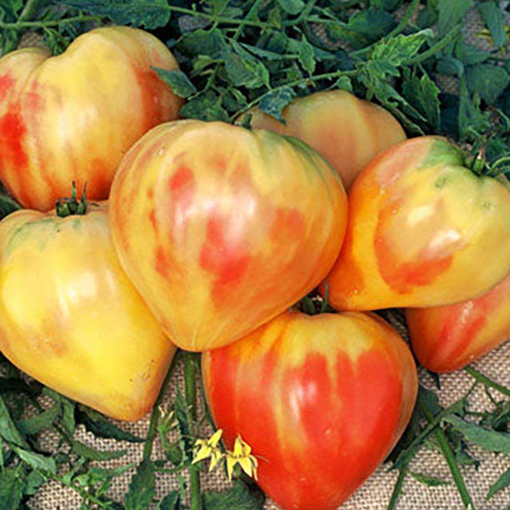 This is the first bicolor oxheart tomato we have seen, and it exhibits the best qualities of both types. Tomatoes weigh 8 ozs. or more and are heart-shaped with smooth golden flesh marbled inside with streaks of red. They are delicious and sweet, somewhat fruity in flavor, and are meaty with very few seeds. Indeterminate. 85 days.