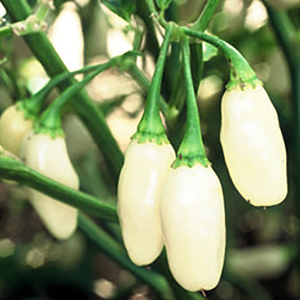 These creamy white peppers are smaller than the typical habanero, only about 1½ inches long and ½ inch across, but with the same habanero heat and distinctive fruity flavor. Expect abundant harvests of these very hot peppers. 90 days.