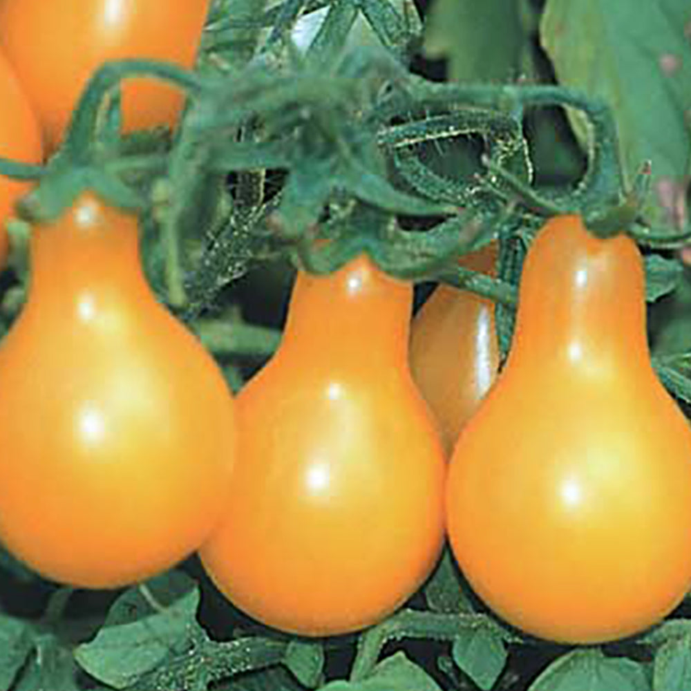 These miniature pear-shaped tomatoes are 1-3/4 to 2 inches long and clear yellow in color. They are delightfully sweet, considered by many as 'garden candy'. Baskets of these are as pretty as can be. Tall plants bear large and continuous harvests. Indeterminate. 78 days.