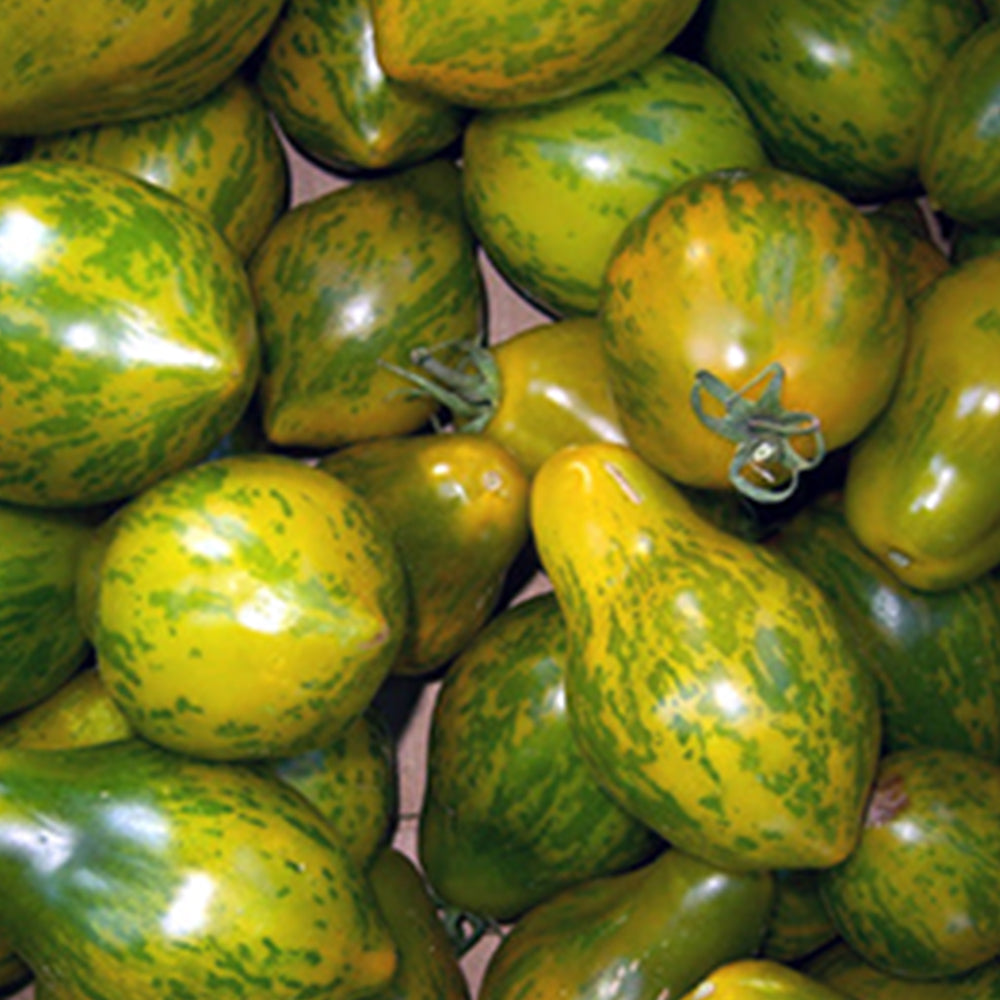 This unique little tomato is a plum-shaped version of Green Zebra and was found as a naturally occurring variant. It has the same beautiful chartreuse green background and bright yellow streaks as Green Zebra, but offers a sweeter taste. The variety was originally named "Michael Pollan." Indeterminate. 75 days.