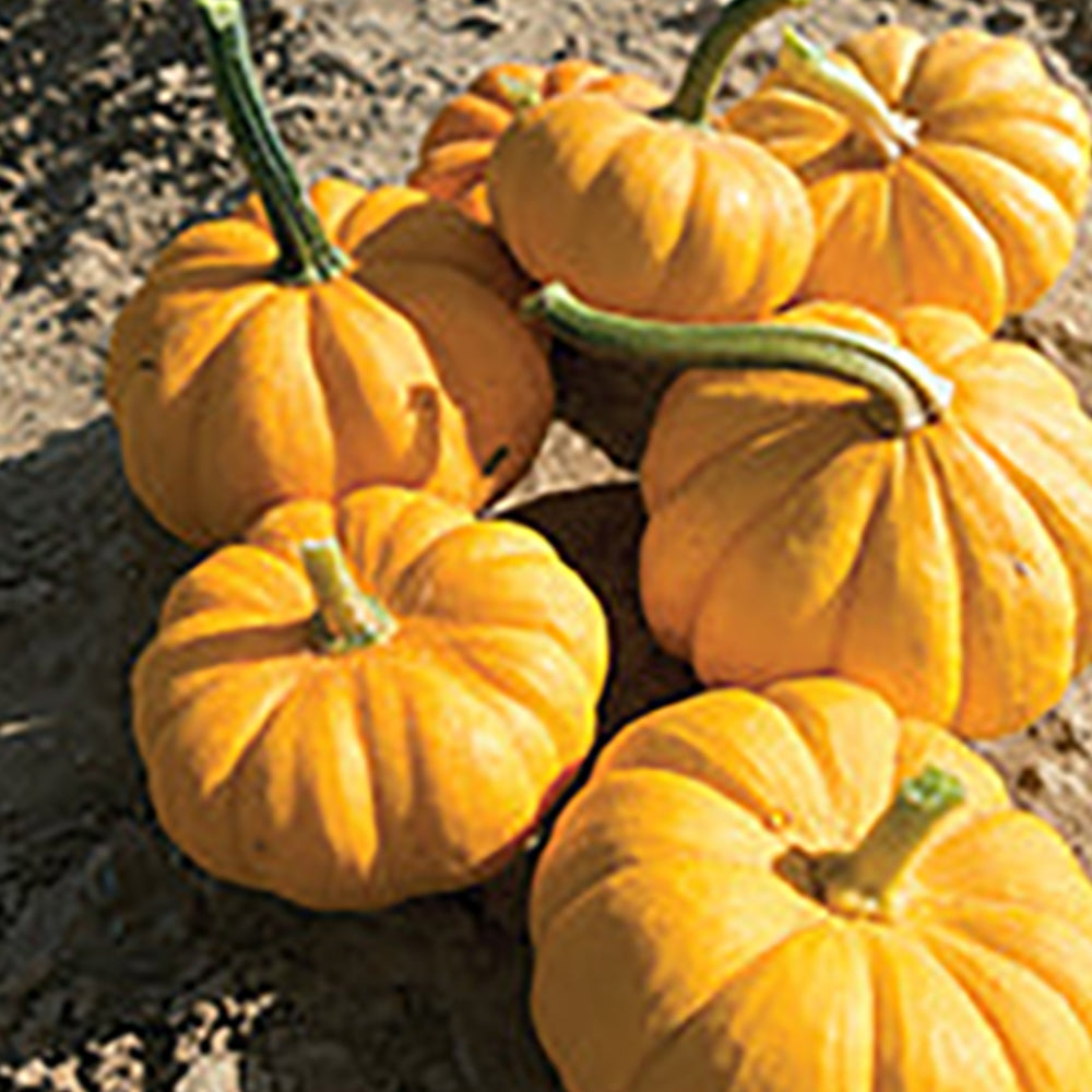 These miniature pumpkins have small yet vigorous vines that produce between 8 and 20 flattened, deeply ribbed fruits, averaging 2 inches tall and 3 to 6 inches in diameter, and weigh 3 to 8 ounces. The attractive orange rind is appealing and edible. Often used for decoration in holidays, the fruit will keep for up to 12 months if cured on the vine. 110 days.