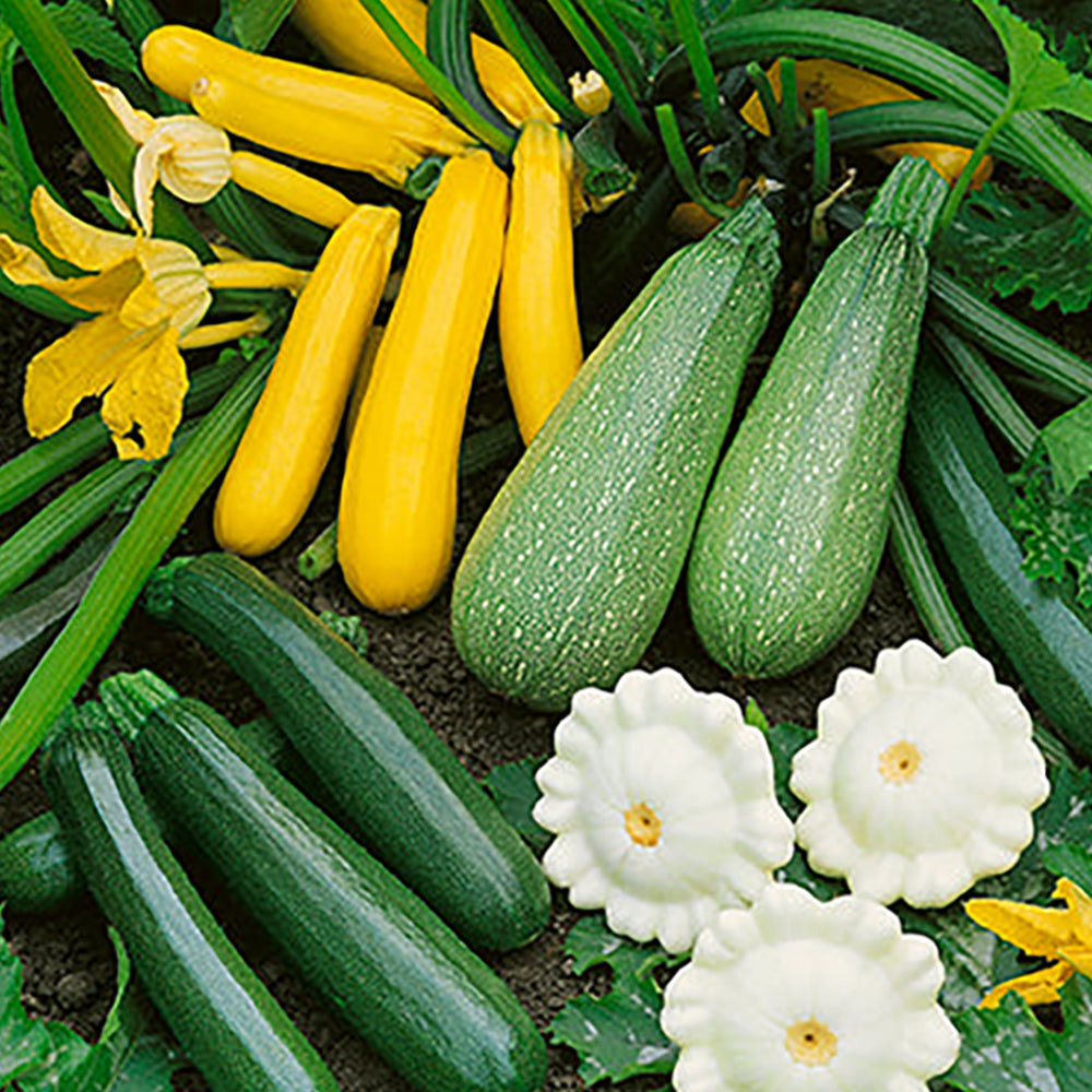 The productive semi-open plant produces smooth light-yellow fruits with curved neck, maturing to yellow with creamy white flesh. Pick fruits at 5 to 6 inches for best flavor. 49 days.