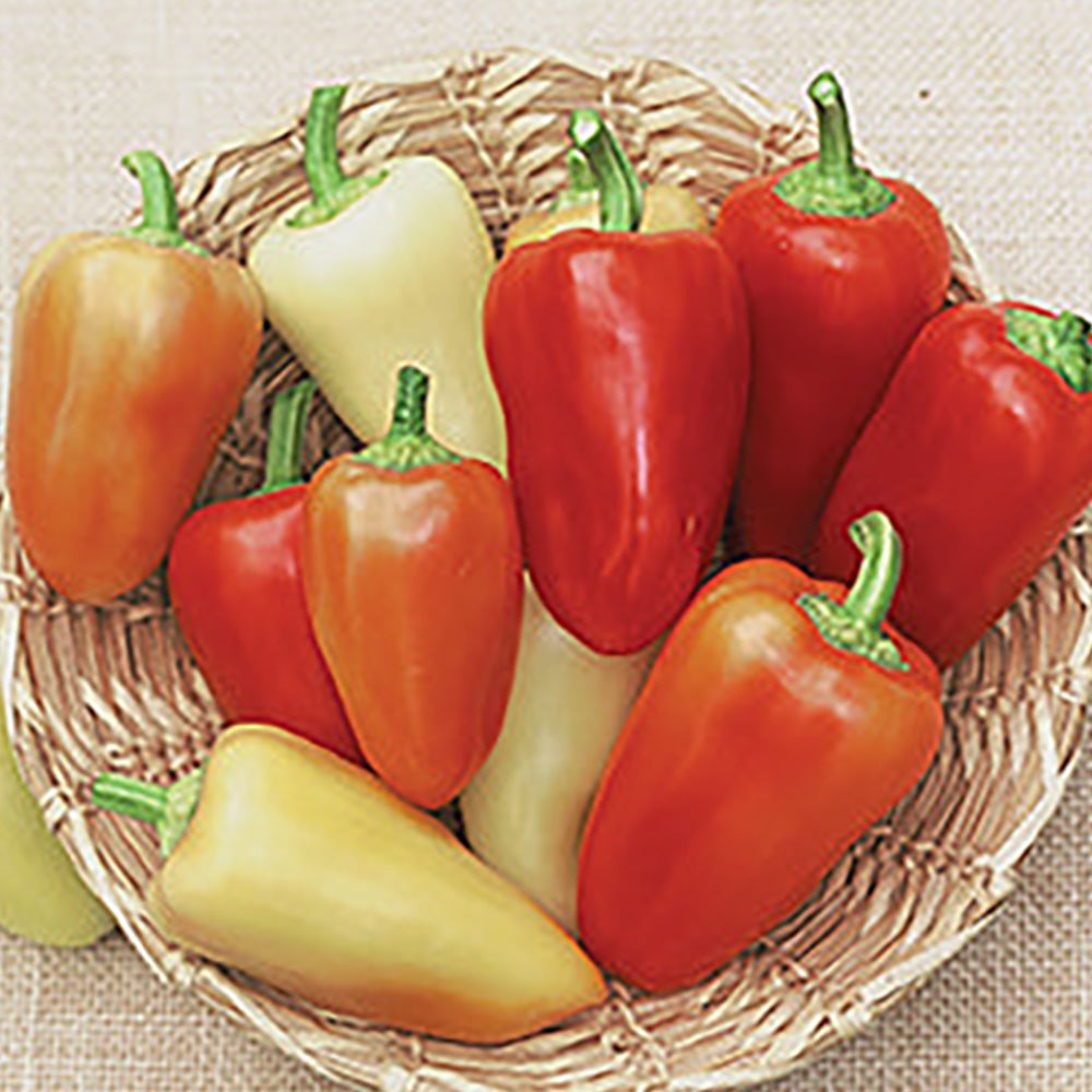 An improved Santa Fe Grande type that offers earliness, superior size, milder flavor, and higher yields. Fleshy peppers, 4 in. long and 2 in. wide, ripen from yellow to red and have 500 to 600 Scoville units. Use them for salsas, sauces, and pickling, or try them stuffed and then grilled. Vigorous plants set fruit continuously throughout the season. 66 days.
