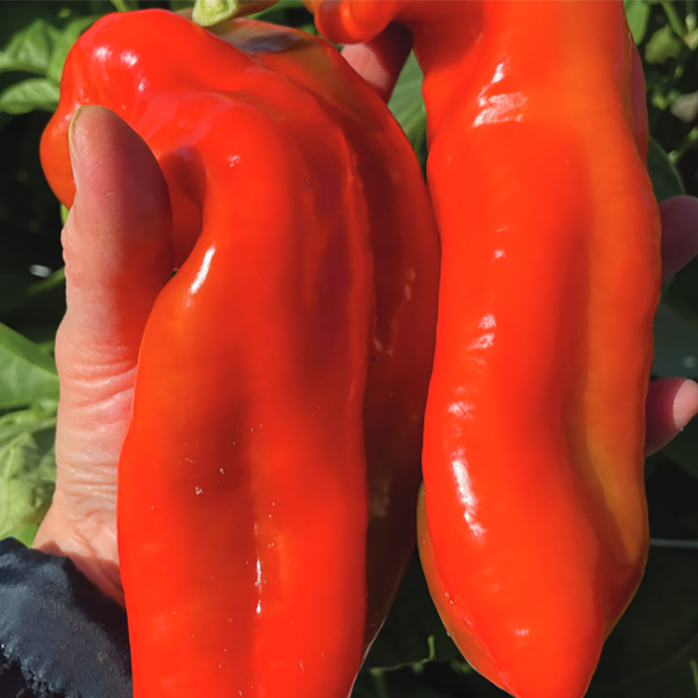 Get ready for Red Impact hybrid: a large 7x4 inch, 8 to 9 ounce pepper that has a touch of sweetness when green which develops to very sweet as it matures to a deep red color. The plants have plenty of productivity and won the All-America Selections National Award! Released by the creators of Giant Marconi, Red Impact blocks Tobamo virus, Pepper Mottle virus, Tobacco Etch virus, Bacterial Spot races -,1,2,3,4,7,8,9 and Root Knot nematodes. Don’t walk; run to get this treasure! 75 days.