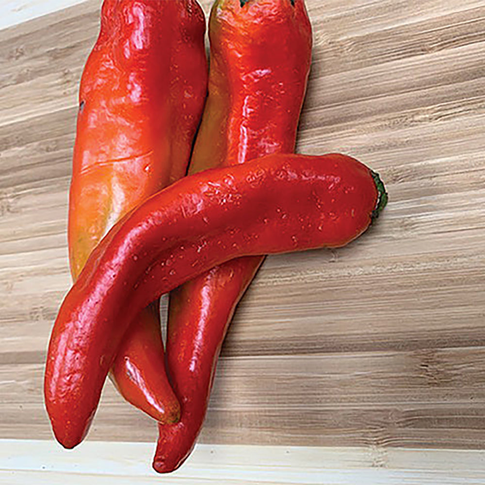 This widely adapted pepper produces an abundant set of fruit that mature from green to red on plants reaching up to 30 inches in height. There are so many fruit, you will be challenged to keep up with the green roasters while many turn to red for a sweeter and more complex flavor. Fruit are normally harvested between 6 and 7 inches in length, and 1 ½ inches in width. 75 days.