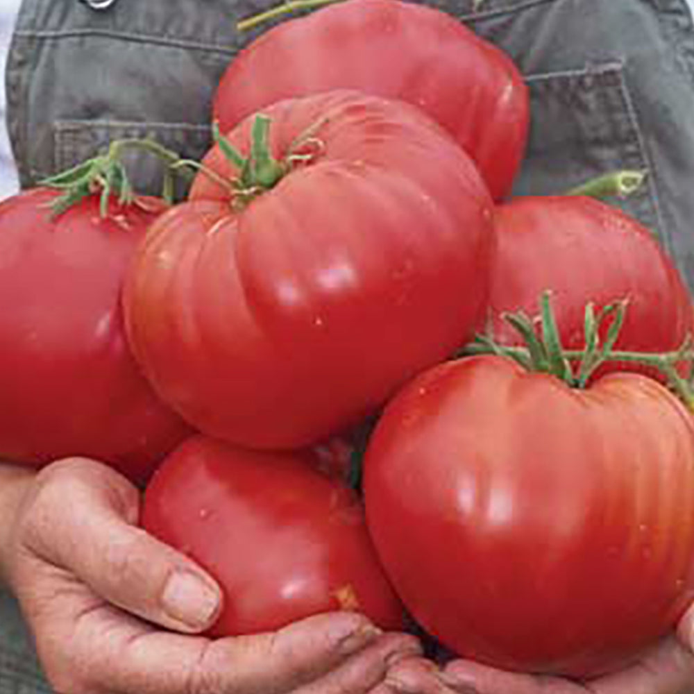 Developed in Ohio, this variety is distinctive for its fruit that averages 2 lbs., but has been known to grow to an enormous 5 lbs. Tomatoes are dark pink and solid meat with smooth blossom ends and a delicious sweet flavor. Some folks make wine from these very sweet tomatoes. Indeterminate. 90 days.