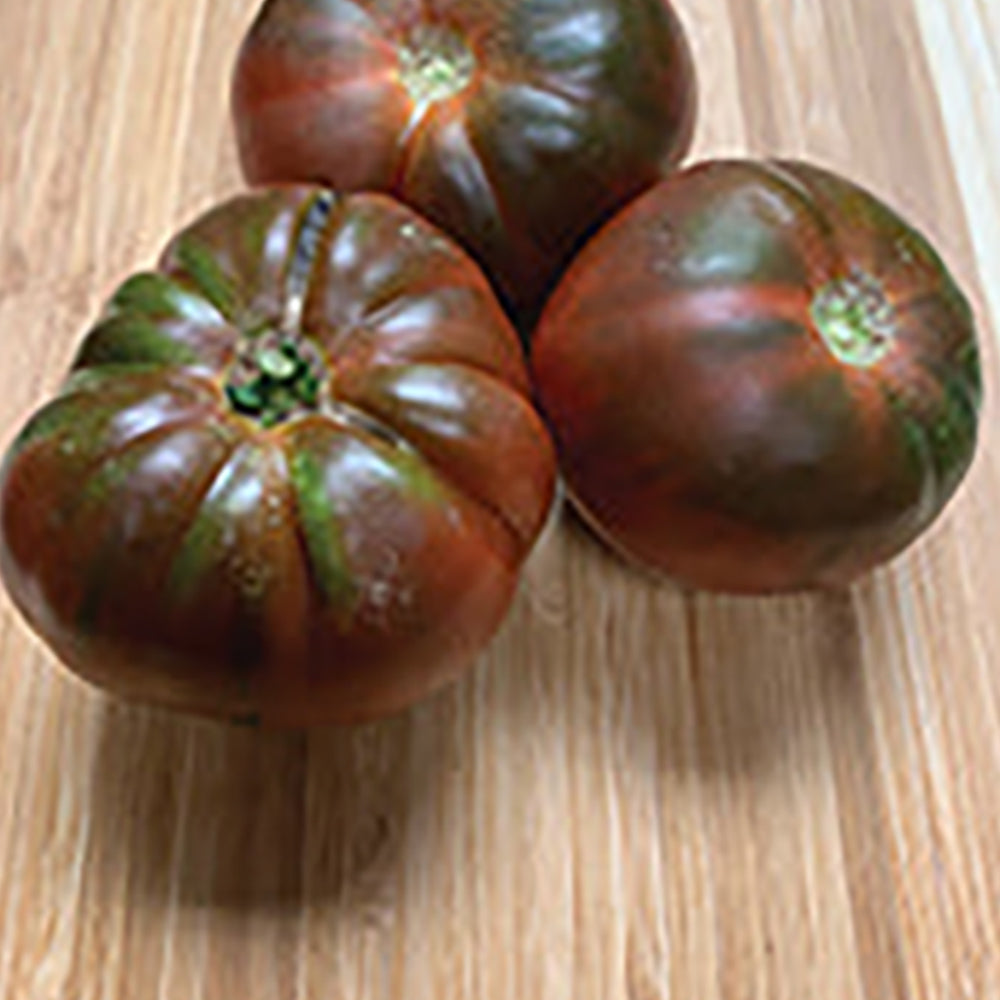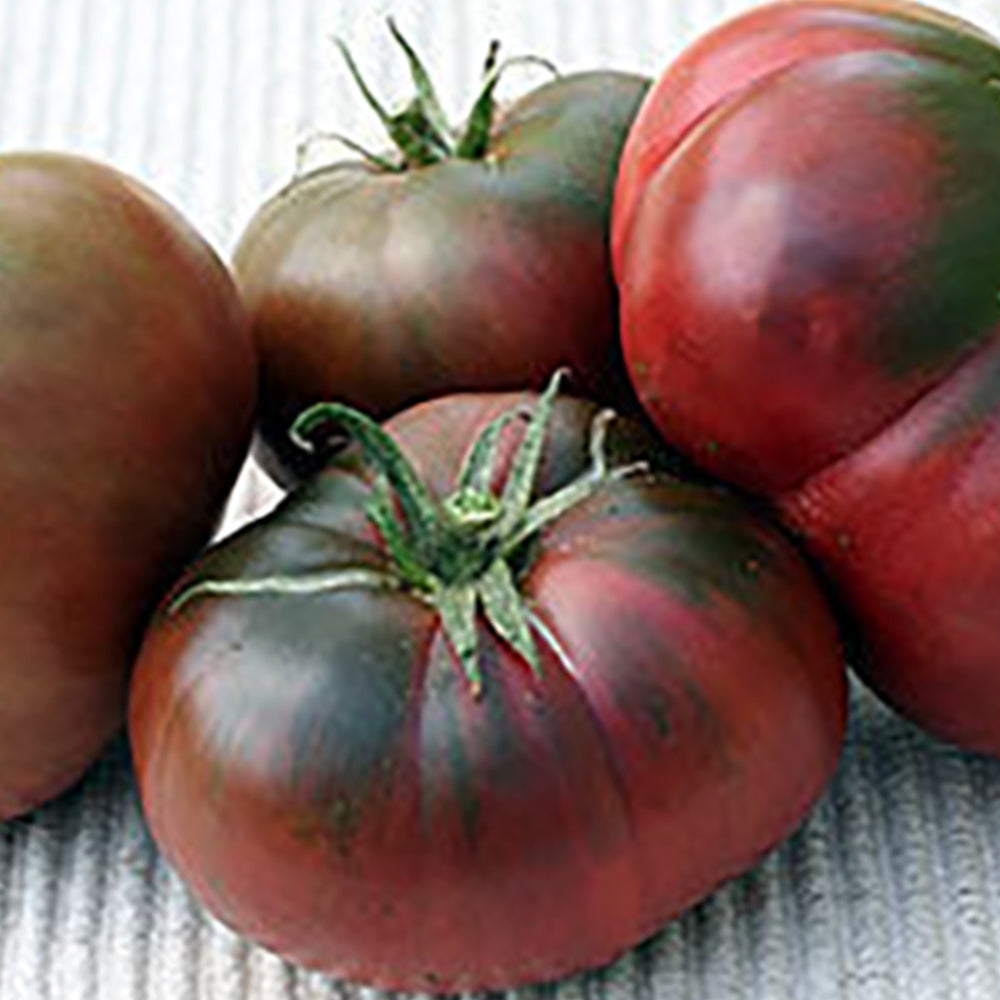 This is among the darkest of the 'black' tomatoes that we've seen and one of the very best tasting tomatoes of any kind that we've sampled. Its flavor is exceptionally rich yet sweet and the essence of delicious summer tomato flavor. Medium to large, 8 to 12 oz. tomatoes are flattened round and smooth, without the cracking or blemishing that seems to plague some black tomatoes. They are dark purplish-brown on the outside with a deep brick-red interior. Indeterminate. 80 days.