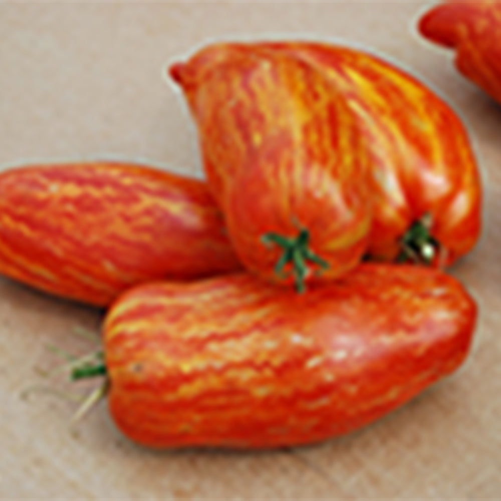 Truly special paste tomato is about 5 inches long and red with jagged golden stripes. Meaty, 6 to 8 oz. tomatoes are great for processing into sauce and paste, but are so flavorful that you will also want to enjoy some fresh in salads. Vigorous plants produce heavily. This variety was developed by John Swenson, a member of Seed Savers Exchange. Indeterminate. 85 days.